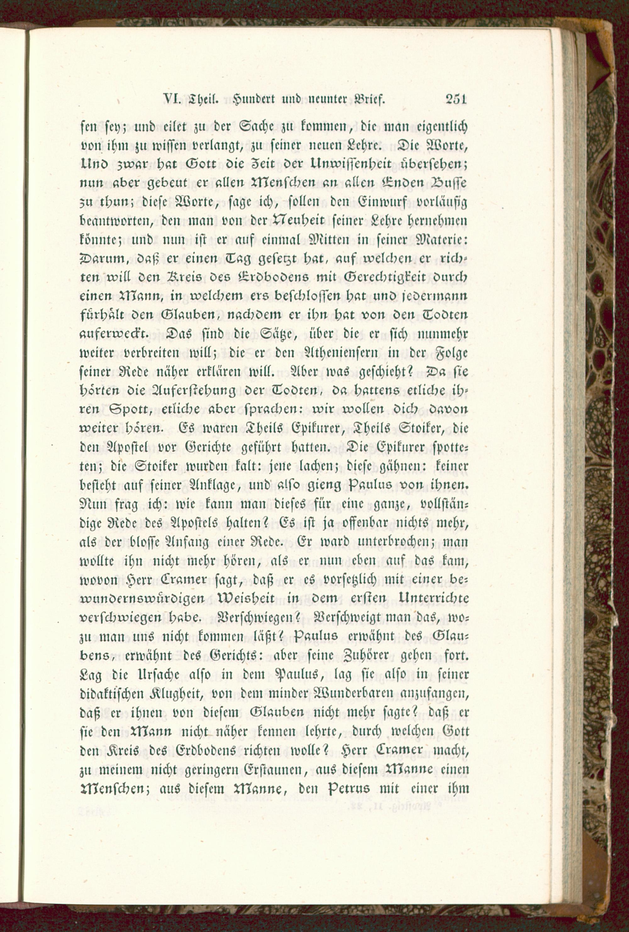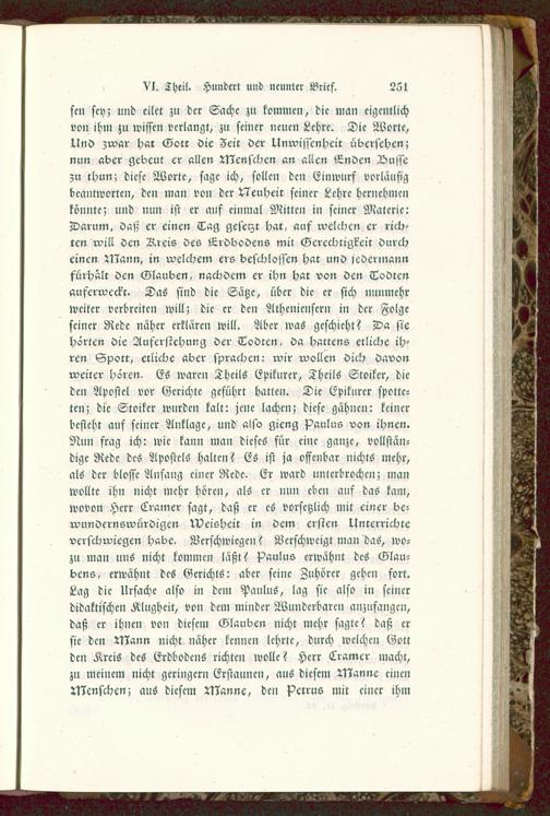 sen sey; und eilet zu der Sache zu kommen, die man eigentlichvon ihm ;u wissen verlangt, zu seiner neuen Lehre. Die Worte,Und zwar h«r Gott die Zeit der Unwissenheit übersehen;nun »der gebeut er allen Menschen an allen Enden Vnssezu thun; diese Worte, sage ich, sollen den Einwurf vorläufigbeantworten, den man von der Neuheit seiner Lehre hernehme»könnte; und nun ist er auf einmal Mitten in seiner Materie:Darum, daß er einen Tag gesetzt hat, auf welchen er rich-ten will den Kreis des Erdbodens mit Gerechtigkeit durcheinen Mann, in welchem ers beschlossen hat und jedermannfürhält den Glauben, nachdem er ihn hat von den Todtenauferweckr. Das sind die Sätze, über die er sich nunmehrweiter verbreiten will; die er den Athcnienscrn in der Folgeseiner Rede näher erklären will. Aber was geschieht? Da siehörten die Auferstehung der Todten, da Haltens etliche ih-ren Spott, etliche aber sprachen: wir wollen dich davonweiter hören. Es waren Theils Epikurcr, Theils Stoiker, dieden Apostel vor Gerichte geführt hatten. Die Epikurcr spotte-ten; die Stoiker wurden kalt: jene lachen; diese gähnen: keinerbesteht auf seiner Anklage, und also gieng Paulus von ihnen.Nun frag ich: wie kann man dieses für eine ganze, vollstän-dige Rede des Apostels halten? Es ist ja offenbar nichts mehr,als der blosse Anfang einer Rede. Er ward unterbrochen; manwollte ihn nicht mehr hören, als er nun eben auf das kam,wovon Herr Lramer sagt, daß er es vorsctzlich mit einer be-wundernswürdigen Weisheit in dem ersten Unterrichteverschwiegen habe. Verschwiegen? Verschweigt man das, wo-zu man uns nicht kommen läßt? Paulus erwähnt des Glau-bens, erwähnt des Gerichts: aber seine Zuhörer gehen fort.Lag die Ursache also in dem Paulus, lag sie also in seinerdidaktischen Klugheit, von dem minder Wunderbare» anzufangen,daß er ihnen von diesem Glauben nicht mehr sagte? daß ersie den Mann nicht näher kennen lehrte, durch welchen Gottden Kreis des Erdbodens richten wolle? Herr Cramcr macht,zu meinem nicht geringern Erstaunen, aus diesem Manne einenMenschen; aus diesem Manne, den Petrus mit einer ihm