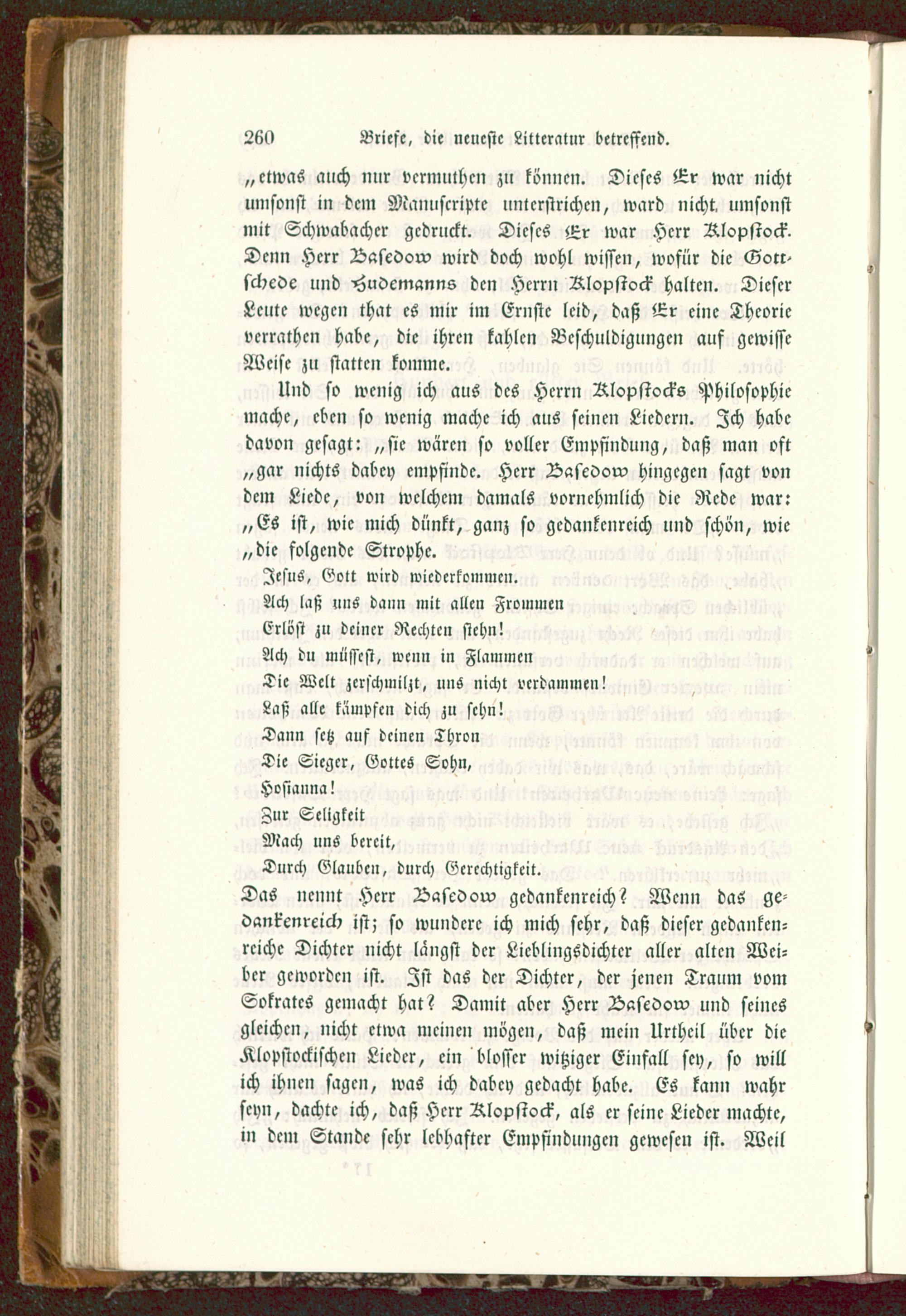 Und so wenig ich aus des Herrn Rlopstocks Philosophiemache, eben so wenig mache ich aus seinen Liedern. Ich habedavon gesagt: „sie wären so voller Empfindung, daß man oft„gar nichts dabey empfinde. Herr Basedow hingegen sagt vondem Liede, von welchem damals vornehmlich die Rede war:„Es ist, wie mich dünkt, ganz so gedankenreich lind schön, wie„die folgende Strophe.