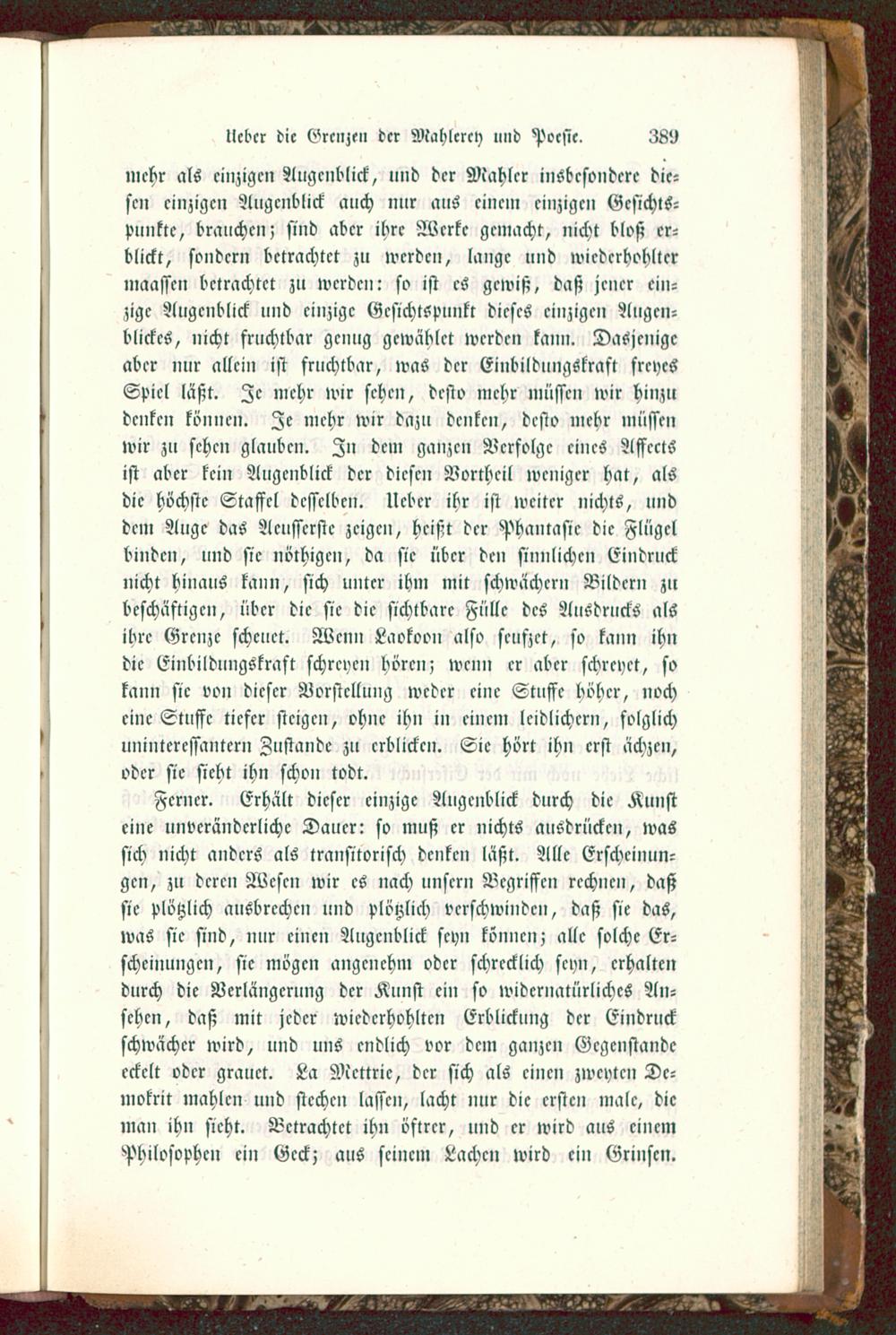 Ferner. Erhält dieser einzige Augenblick durch die Kunsteine unveränderliche Dauer: so muß er nichts ausdrücken, wassich nicht anders als transitorisch dcnkcn läßt. Alle Erscheinun-gen, zu deren Wesen wir es nach unsern Begriffen rechnen, daßsie plötzlich ausbrcchcn und plötzlich verschwinden, daß sie das,was sic sind, nur einen Augenblick seyn können; alle solche Er-scheinungen, sie mögen angenehm odcr schrccklich scyn, erhaltendurch die Verlängerung der Kunst ein so widernatürliches An-sehen, daß mit jeder wiederhohltcn Erblickung der Eindruckschwächer wird, und uns endlich vor dem ganzen Gegenständeeckclt odcr grauct. La Mcttrie, der sich als einen zweyten Dc-mokrit mahlen und stechen lassen, lacht nur die ersten male, dieman ihn sieht. Betrachtet ihn öftrer, und er wird aus einemPhilosophen ein Gcck; aus scincm Lachen wird ein Grinsen.