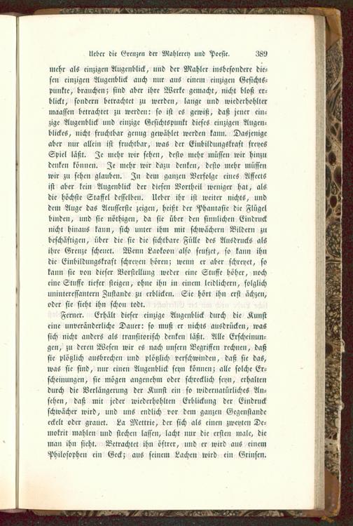 mehr als einzigen Augenblick, und der Mahler insbesondere die-sen einzigen Augenblick auch nur aus einem einzigen Gesichts-punkte, brauchen; sind aber ihre Werke gemacht, nicht bloß er-blickt, sondern betrachtet zu werden, lauge und wicdcrhohltcrmaasscn betrachtet zu werden: so ist es gewiß, daß jener ein-zige Augenblick und einzige Gesichtspunkt dieses einzigen Augen-blickes, nicht fruchtbar genug gcwäblet werden kann. Dasjenigeaber nur allein ist fruchtbar, was der Einbildungskraft freyesSpiel läßt. Ze mehr wir sehen, desto mehr müssen wir hinzudenken können. Ze mehr wir dazu denken, desto mehr müssenwir zu sehen glauben. Zn dem ganzen Verfolge eines Affcctsist aber kein Augenblick der diesen Vortheil weniger hat, alsdie höchste Staffel desselben. Ueber ihr ist weiter nichts, unddem Auge das Acusscrstc zeigen, heißt der Phantasie die Flügelbinden, und sie nöthigen, da sie über den sinnlichen Eindrucknicht hinaus kann, sich unter ihm mit schwacher» Bildern zubeschäftigen, über die sie die sichtbare Fülle des Ausdrucks alsihre Grenze scheuet. Wenn Laokoon also seufzet, so kann ihndie Einbildungskrast schreyen hören; wenn er aber schreyet, sokann sie von dieser Vorstellung weder eine Stuffc höher, nocheine Stuffc tiefer steigen, ohne ihn in einem leidlichem, folglichunintercssantcrn Zustande zu erblicken. Sie hört ihn erst ächzcn,odcr sie sieht ihn schon todt.