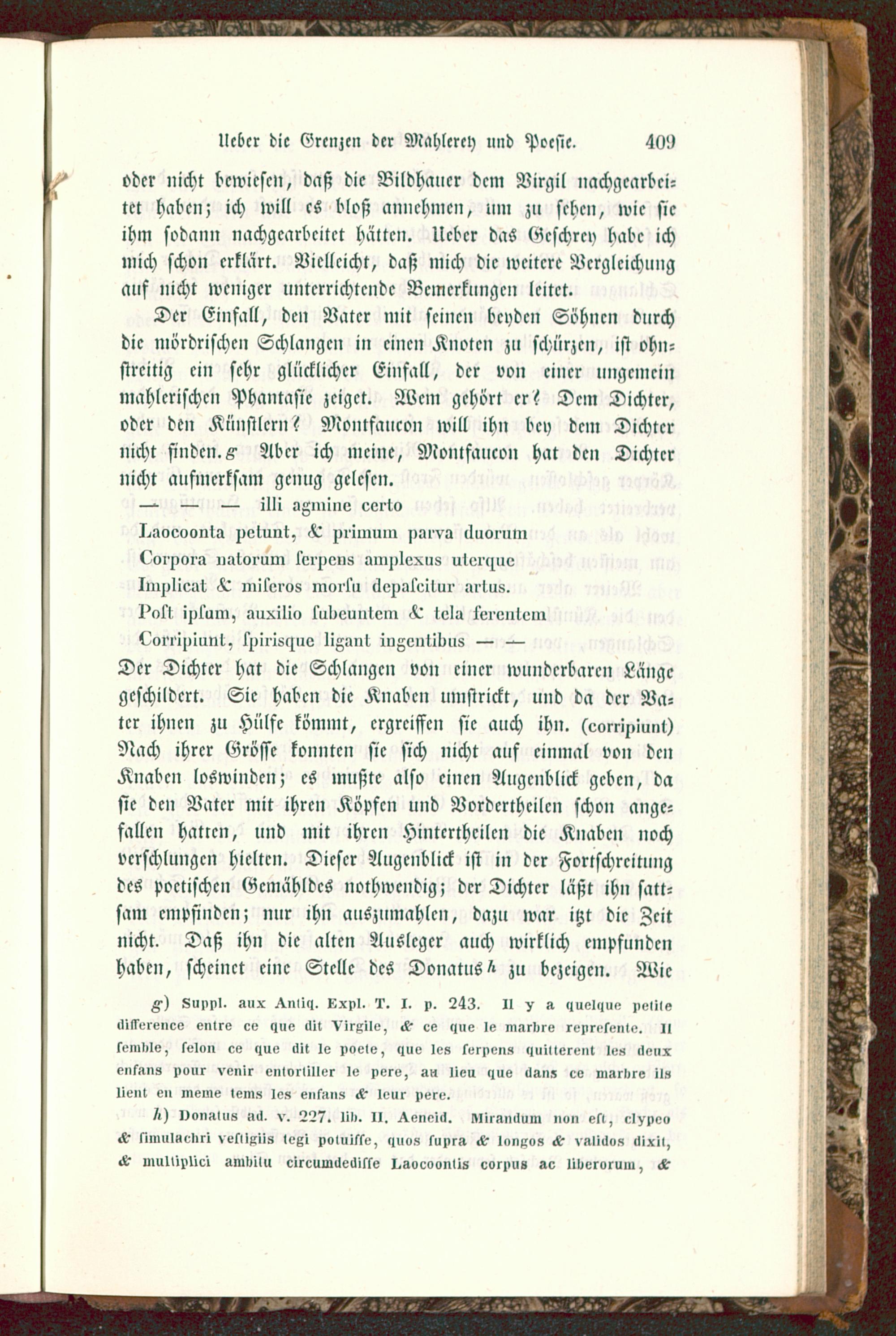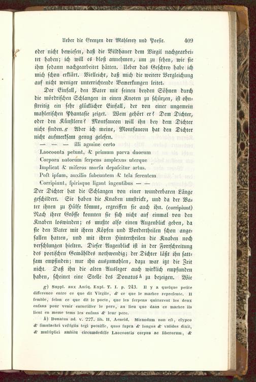<üo!'riuliint, l^ilris^iiv lignnt iugeiltilius — —Der Dichter hat die Schlangen von einer wunderbaren Längegeschildert. Sie haben die Knaben nmstrickt, und da der Va-ter ihnen zu Hülfe kömmt, crgrciffen sie auch ihn. (eorrifliunl)Nach ihrer Grösse konnten sie sich nicht auf einmal von denKnaben loswinden; es mußte also einen Augenblick geben, dasie den Vater mit ihren Köpfen und Vorderthcilcn schon ange-fallen hatten, und mit ihren Hintcrthcilcn die Knaben nochverschlungen hielten. Dieser Augenblick ist in der Fortschrcitungdes poetischen Gemähldes nothwendig; der Dichter läßt ihn satt-sam empfinden; nur ihn auszumahlen, dazu war itzt die Zeitnicht. Daß ihn die alten Ausleger auch wirklich empfundenhaben, scheinet eine Stelle des Donatus^ zu bezeigen. Wie