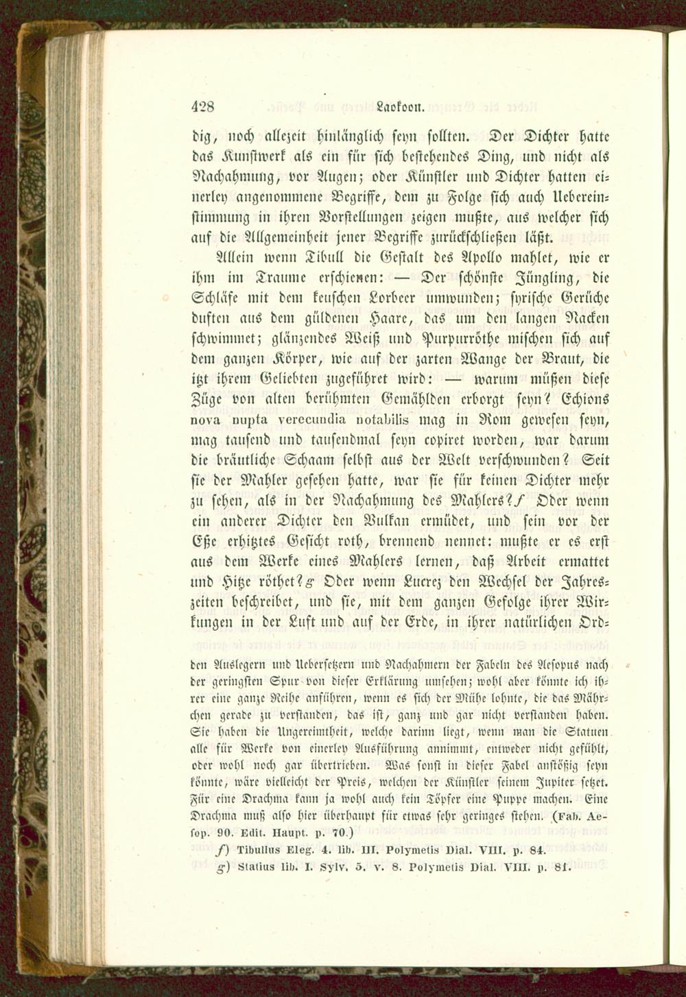 Allein wenn Tibull die Gestalt des Apollo mahlet, wie erihm im Traume erschienen: — Der schönste Jüngling, dieSchläfe mit dem keuschen Lorbeer umwunden; syrische Gerücheduften aus dem güldenen Haare, das um den langen Nackenschwimmet; glänzendes Weiß und Purpurröthe mischen sich aufdem ganzen Körper, wie auf der zarten Wange der Braut, dieitzt ihrem Geliebten zugcführet wird: — warum müßen dieseZüge von alten berühmten Gemählden erborgt seyn? Echionsnova inipta veroeuuclia iwwdilis mag in Rom gewesen seyn,mag tausend und tausendmal seyn copirct worden, war darumdie bräutliche Schaam selbst aus der Welt verschwunden? Seitsie der Mahler gesehen hatte, war sie für keinen Dichter mehrzu sehen, als in der Nachahmung des Mahlers?/ Oder wennein anderer Dichter den Vulkan ermüdet, und sein vor derEßc erhitztes Gesicht roth, brennend nennet: mußte er es erstaus dem Werke eines Mahlers lernen, daß Arbeit ermattetund Hitze röchet? F Oder wenn Lucrcz den Wechsel der Jahres-zeiten beschreibet, und sie, mit dem ganzen Gefolge ihrer Wir-kungen in der Lust und auf der Erde, in ihrer natürlichen Ord-