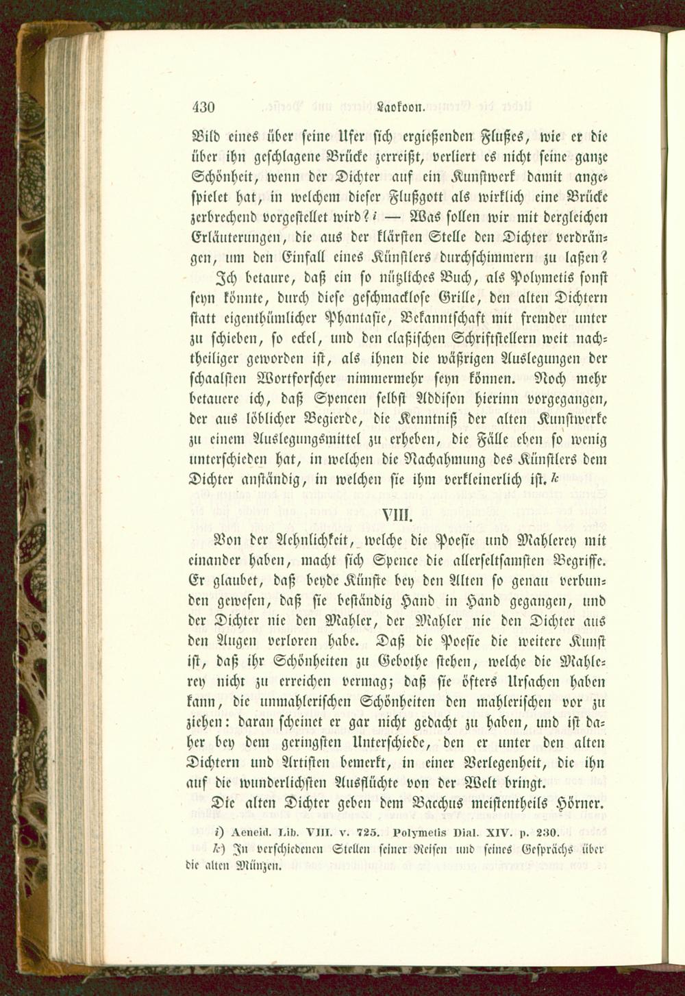 Wild eines über seine Ufer sich ergießenden Flußcs, wie er dieüber ihn geschlagene Brücke zerreißt, verliert es nicht seine ganzeSchönheit, wenn der Dichter ans ein Kunstwerk damit ange-spielet hat, in welchem dieser Flußgott als wirklich eine Brückezerbrechend vorgestellet wird ? - — Was sollen wir mit dergleichenErläuterungen, die aus der klarsten Stelle den Dichter verdrän-gen, um den Einfall eines Künstlers durchschimmern zu laßen?
