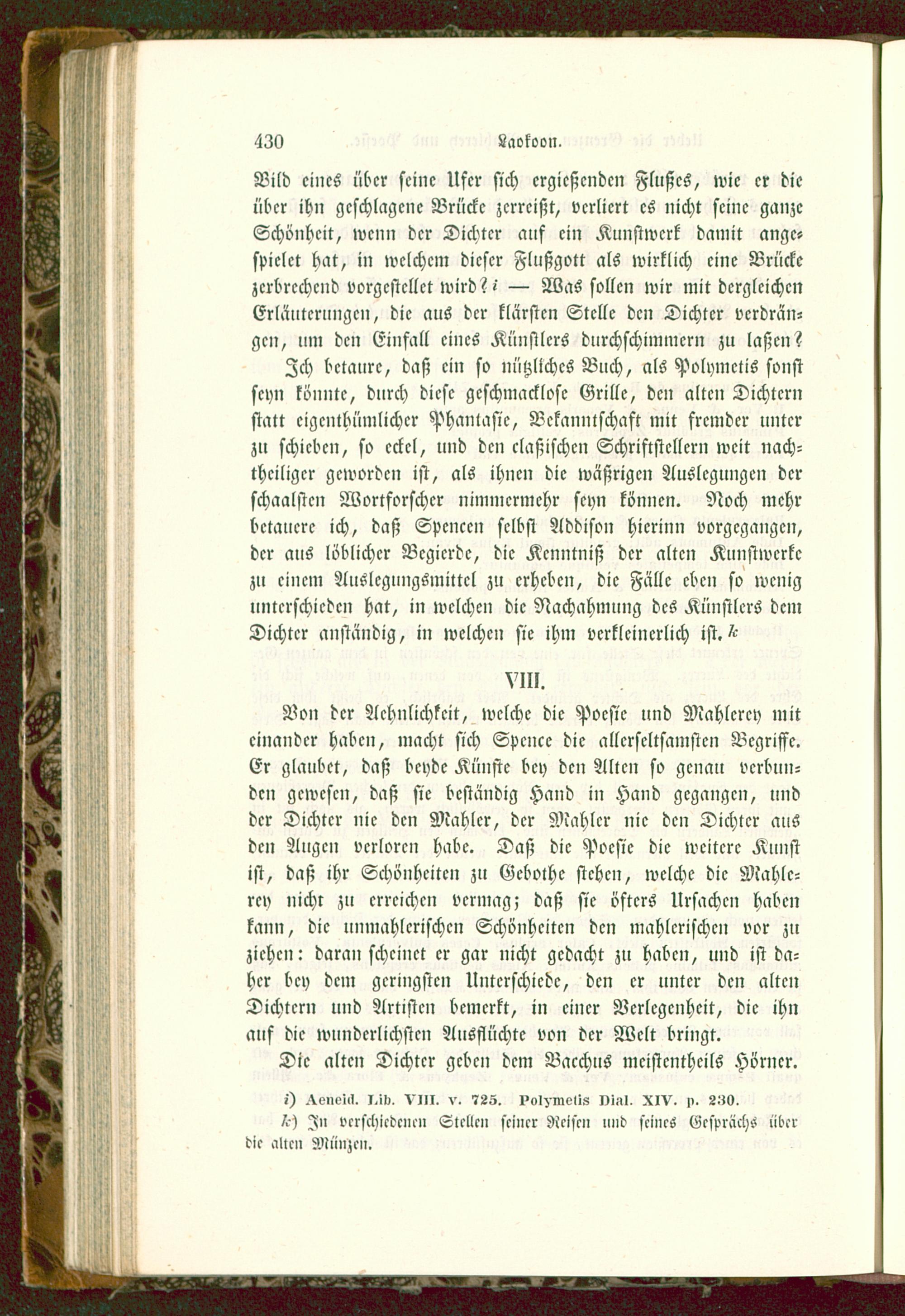 Ich bctaure, daß ein so nützliches Buch, als Polymctis sonstseyn könnte, durch diese geschmacklose Grille, den alten Dichternstatt eigenthümlicher Phantasie, Bekanntschaft mit fremder unterzu schieden, so eckel, und den elastischen Schriftstellern weit nach-thciligcr geworden ist, als ihnen die wäßrigen Auslegungen derschaalstcn Wortforschcr nimmermehr seyn können. Noch mehrbelauere ich, daß Spenccn selbst Addison hicrinn vorgegangen,der aus löblicher Begierde, die Kenntniß der alten Kunstwerkezu einem Auslegungsmittcl zu erheben, die Fälle eben so wenigunterschieden hat, in welchen die Nachahmung des Künstlers demDichter anständig, in welchen sie ihm verkleincrlich ist. K