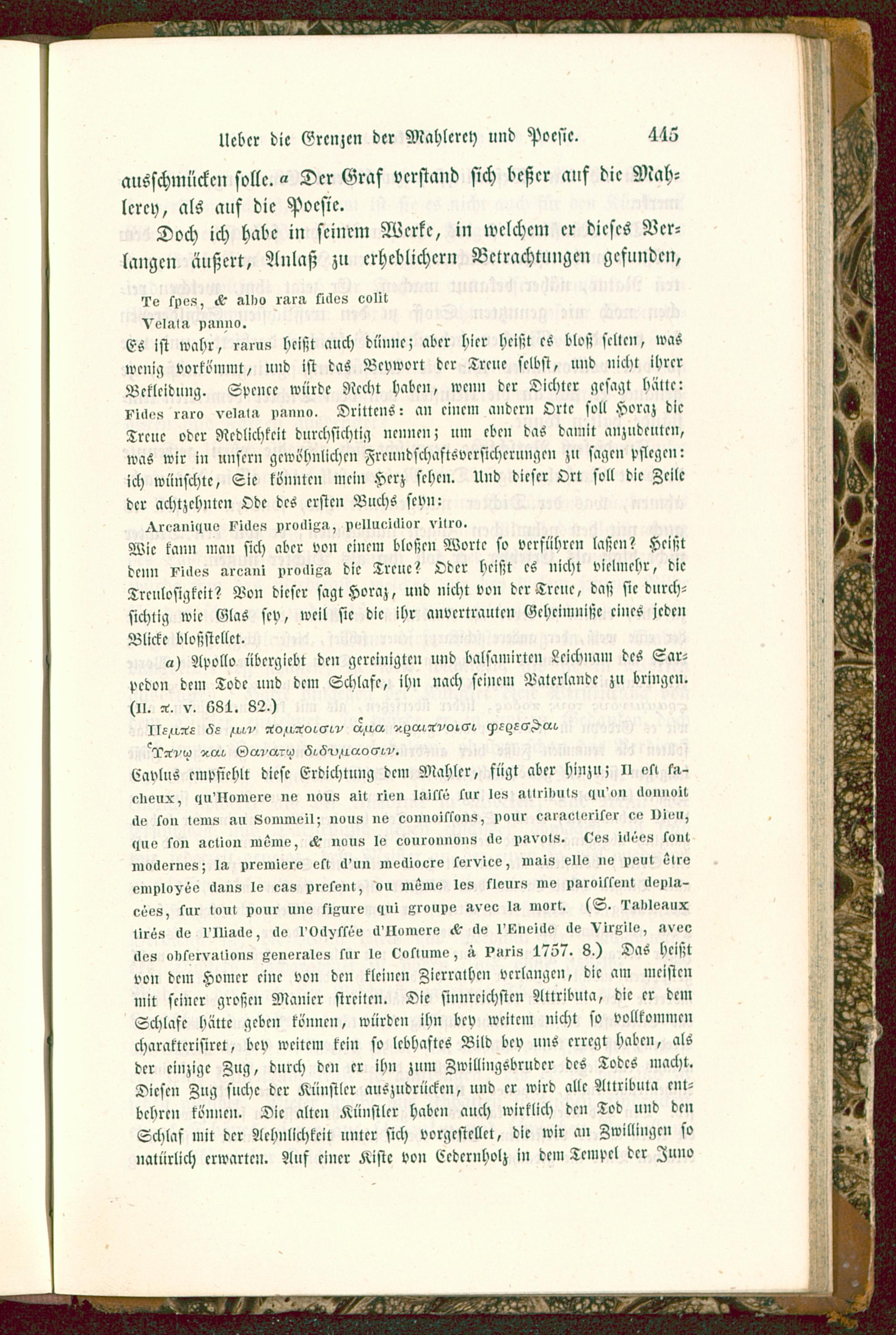 Lavlus cnipfithlt diese Erdichtung den, Mahler, fügt aber hinzu; II vtl f-t-<!>>eiix, qn'IIomers ne »ou» »it rie» titltte tur leü »Ilrüttilü <i>i'»» cleuuuit«tu tu» lein « ,in Senuneil; neu« ne co»noisto»>!, nour ci>c»eleriter ce I)i(^>,<lue ton »eliun meine, lk7 noiiji le cvuronnvns lle nitvol». l?eü iilee« suittmnilernes; I.T Premiere etc it'un mectioere kervice, inuis eile »v peut elrvemnlovee il-in» le c»s present, ou meine les slenr« ine i>gr»ittent llepla-cees, tnr tont nnur une Nizurv <t»i xroune »vec I» inert. (S. 'I'»l>Ie»uxlireü ue I'IIiücle, cle I'0>I>ttee >I'IIeNlere cle I'Liieille >te Virizilv, nvee»tes olikerviiUonii xenerstes 5»r te l^etlumv, » piiri» 1727. 8.) Das heißtvon dem Homer eine von den kleinen Zicrralhcn verlangen, die am meistenmit seiner großen Manier streiten. Die sinnreichsten Attribula, die er demSchlafe hätte geben können, würden ihn bey weitem nicht so vollkommencharakterisiret, bcv weitem kein so lebhaftes Bild bcv nns erregt liabcn, alsder einzige Zug, durch den er ihn zum Zwillingsbrudcr des Todes macht.Diesen Zug snchc der Künstler auszudrücken, und er wird alle Attribut» cnt-belirc» können. Die alten Künstler haben auch wirklich den Tod und denSchlaf mit der Achnllchkcit unter sich vorgestellet, die wir an Zwillingen sonatürlich erwarten. Ans einer Kiste von Eedcrnholz in dem Tempel der Zuno