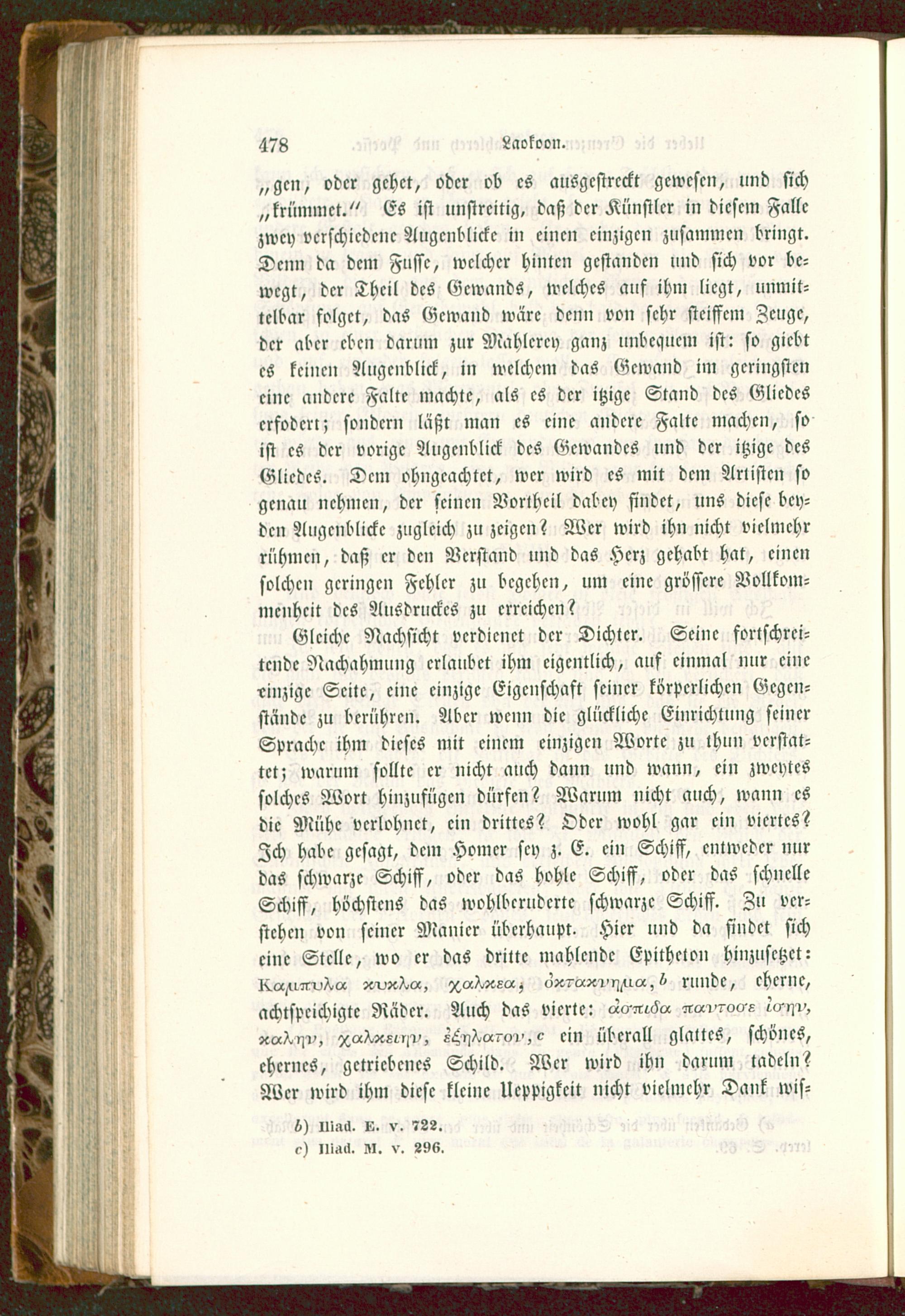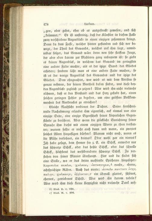 Gleiche Nachsicht verdienet der Dichter. Seine fortschrei-tende Nachahmung erlaubet ihm eigentlich, auf einmal nur eine-einzige Seite, eine einzige Eigenschaft seiner körperlichen Gegen-stände zu berühren. Aber wenn die glückliche Einrichtung seinerSprache ihm dieses mit einem einzigen Worte zu thun verstat-tet; warum sollte er nicht auch dann und wann, ein zweytessolches Wort hinzufügen dürfen? Warum nicht auch, wann esdie Mühe verlohnet, ein drittes? Oder wohl gar ein viertes?Zch habe gesagt, dem Homer sey z. E. ein Schiff, entweder nurdas schwarze Schiff, oder das hohle Schiff, oder das schnelleSchiff, höchstens das wohlbcrudcrtc schwarze Schiff. Zu ver-stehen von seiner Manier überhaupt. Hier und da findet sicheine Stelle, wo er das dritte mahlendc Epitheton hinzusetzet:K.«^I,II^X,« xvxX,«, »XT-L-Xi'i^oc, i runde, eherne,