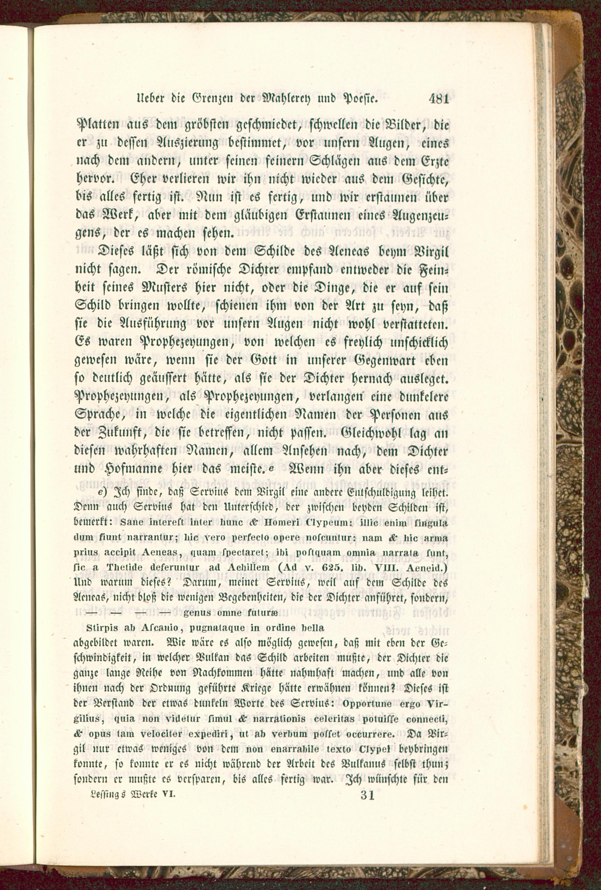 abgebildet waren. Wie wäre es also möglich gewesen, daß mit eben der Ge-schwindigkeit, in welcher Vulkan das Schild arbeiten mußte, der Dichter dieganze lange Reihe von Nachkomme» hatte nahmhast machen, und alle vonihnen nach der Ordnung geführte Kriege hatte erwähnen können? Dieses istder Beistand der etwas dunkeln Worte des Scrvius: opportune <?^o vi»ßilius, «zu!» non viUi-tur fimul <k° »»rrtUionis cvlvritss poluitie evnnecli,«k? onus lilin v«-Ioeit»r oxpeiliri, ut kk verkum potsvi »l!ourr»re. Da Bir-gil nur etwas weniges von dem »VN snürrsiiiie texto ei^pet beybringe»konnte, so konnte er es nicht während der Arbeit des Vulkanns selbst thun;sonder» er mußte es »ersparen, bis alles fertig war. Ich wünschte für denLessiiigs Werks vi, ZI
