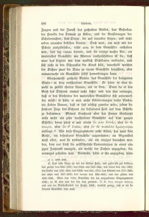 Gleicherweise zertheilt Boivin das Gemählde der belagertenStadt« in drey verschiedene Gemählde. Er hätte es eben so-wohl in zwölfe theilen können, als in drey. Denn da er denGeist des Dichters einmal nicht faßte und von ihm verlangte,daß er den Einheiten des materiellen Gemähldes sich untcrwerf-fen müsse: so hätte er weit mehr Ucbcrtrctungcn dieser Einhei-ten finden können, daß es fast nöthig gewesen wäre, jedem be-sondern Zuge des Dichters ein besonderes Feld auf dem Schildezu bestimmen. Meines Erachtcns aber hat Homer überhauptnicht mehr als zehn verschiedene Gemählde auf dem ganzenSchilde; deren jedes er mit einem -'v x^^x, oder -v 6-