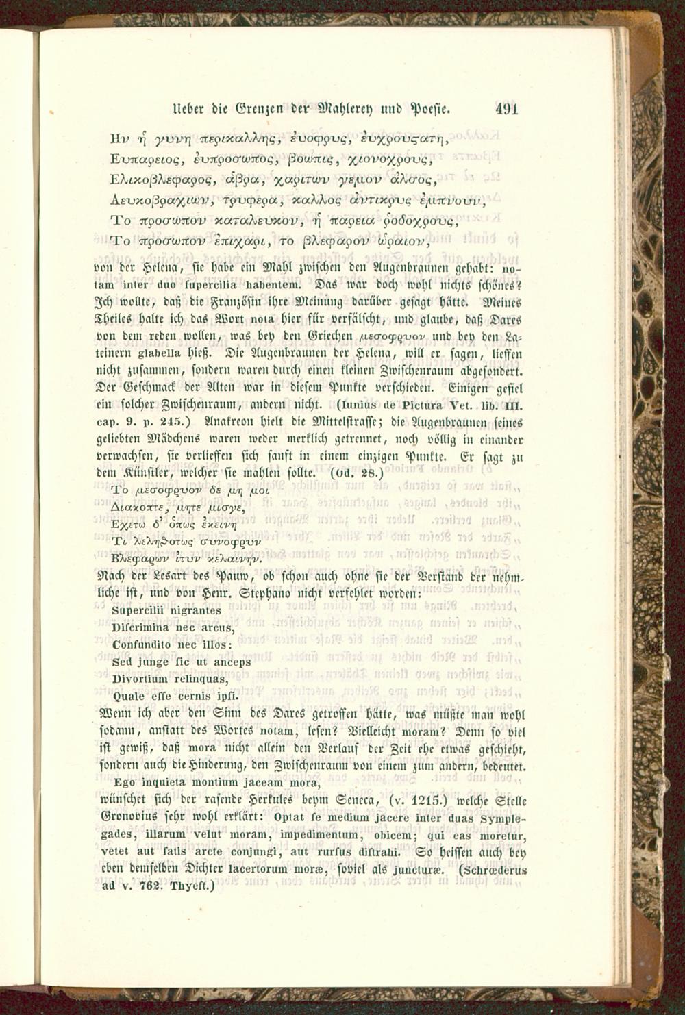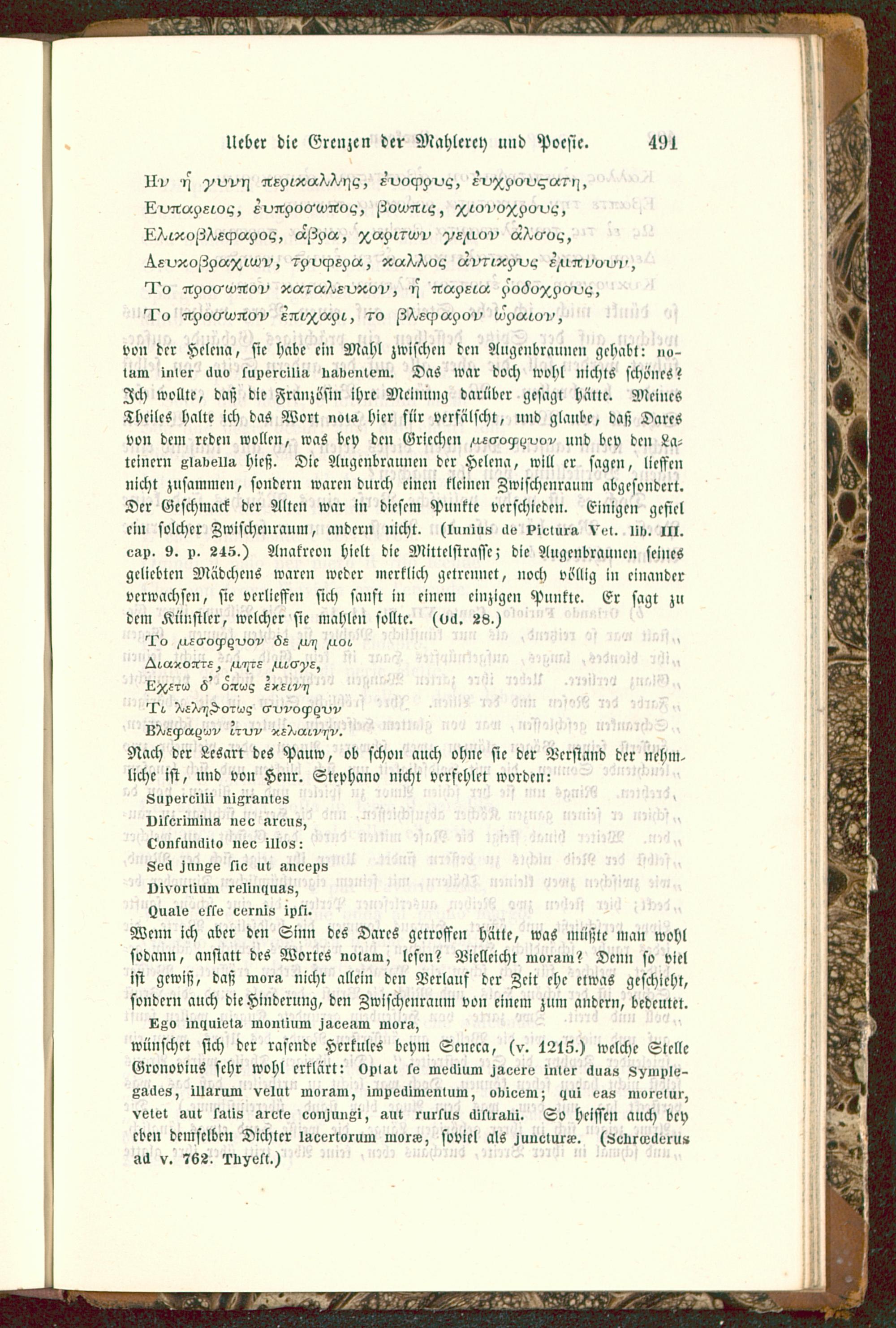 von der Helena, sie habe ein Mahl zwischen den Slugcnbraunen gehabt: »»-lilm i,»er >Iuo luneroiliit kalivittem. Das war doch wohl nichts schönes?Ich wollte, daß die Französin ihre Meinung darüber gesagt hatte. MeinesTheiles halte ich das Wort not» hier für verfälscht, nnd glaube, daß Darcsvon dem reden wollen, was bey den Griechen ^.ko-o>z^i_»zv und bey den La-teinern Aiiibeiis, hieß. Die Zlugcnbrauncn der Helena, will er sagen, liessennicht zusammen, sondern waren durch einen kleinen Zwischcnraum abgesondert.Der Geschmack der Alten war in diesem Punkte verschieden, Einigen gefielein solcher Zwischenraum, andern nicht, (luniu» xilUur«, v,->. »b. in.cap. S. i>. 2jS.) Anakrcon hielt die Mittelstrassc; die Zlugcnbrauncn seinesgeliebten Mädchens waren weder merklich gctrcnnct, noch völlig in einanderverwachsen, sie verliesse» sich sanft in einem einzigen Punkte. Er sagt zudem Künstler, welcher sie mahlen sollte. (d>>. ss.)