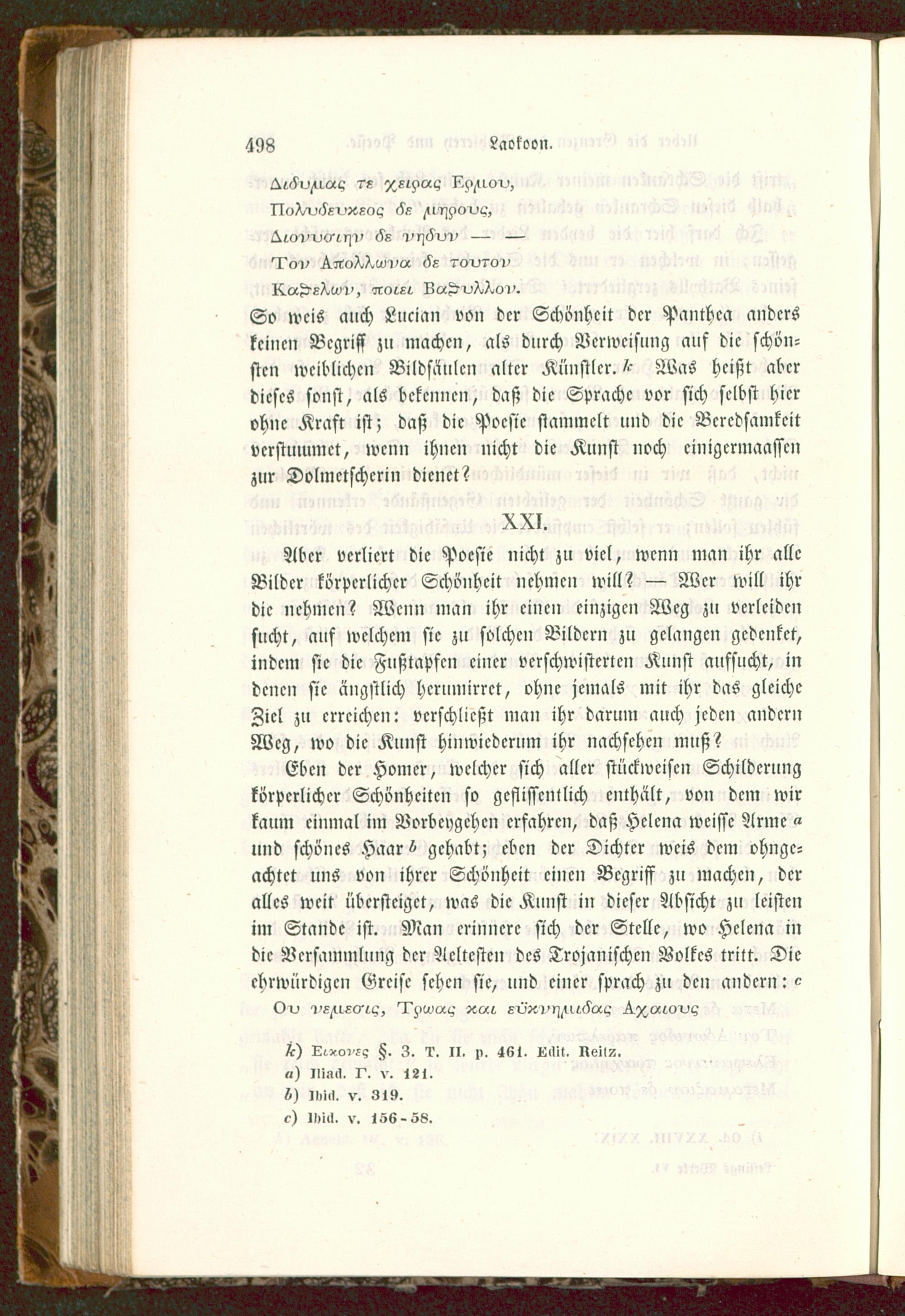 Eben dcr Homer, welcher sich aller stückwciscn Schilderungkörperlicher Schönheiten so geflissentlich enthält, von dem wirkaum einmal im Vorbeygehen erfahren, daß Helena weisse Arme »lind schönes Haar 6 gehabt; eben dcr Dichter wcis dcm ohngc-achtct uns von ihrer Schönheit einen Begriff zu machen, deralles weit übcrstcigct, was dic Knnst in dicscr Absicht zu leistenim Stande ist. Man erinnere sich dcr Stelle, wo Helena indic Btrsammlung dcr Acltcste» des Trojanischen Volkes tritt. Dieehrwürdigen Greise sehen sie, und einer sprach zu den andern: ^