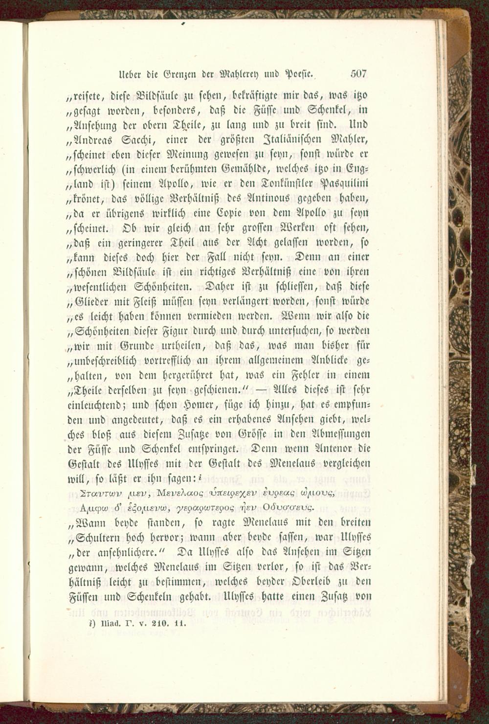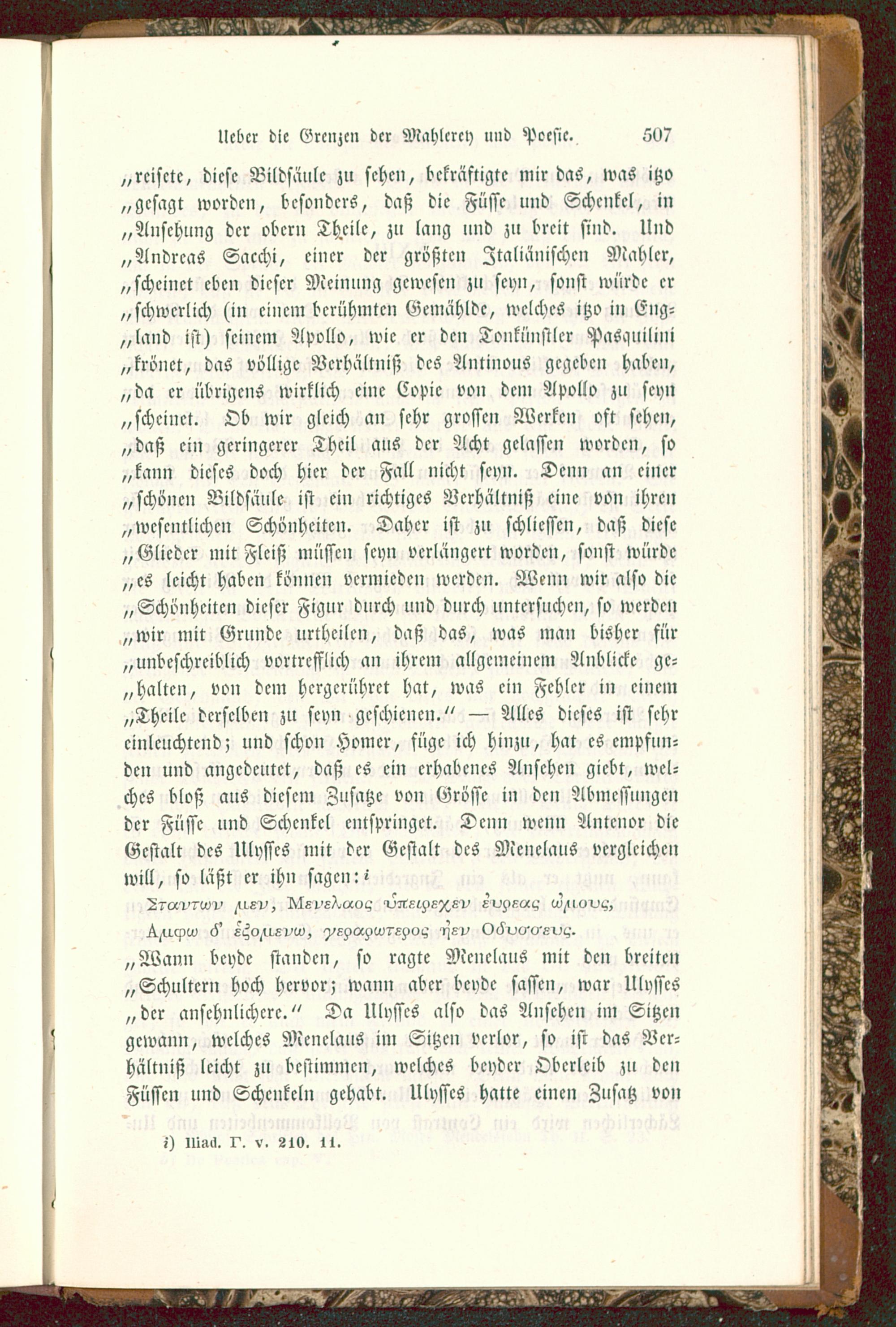 „rcisctc, diese Bildsäule zu sehen, bekräftigte mir das, was itzo„gesagt worden, besonders, daß die Füsse und Schenkel, in„Ansehung der obern Theile, zu lang nnd zu breit sind. Und„Andreas Sacchi, einer der größten Italiänischen Mahler,„scheinet eben dieser Meinung gewesen zu seyn, sonst würde er„schwerlich (in einem berühmten Gemählde, welches itzo in (5ng-„land ist) seinem Apollo, wie er den Tonkünstlcr Pasauiliiii„krönet, das völlige Verhältniß des Antinouö gegeben haben,„da er übrigens wirklich eine Copic von dem Apollo zu seyn„scheinet. Ob wir gleich an sehr grossen Werken oft sehen,„daß ein geringerer Theil aus der Acht gelassen worden, so„kann dieses doch hier der Fall nicht seyn. Denn an einer„schönen Bildsäule ist ein richtiges Verhältniß eine von ihren„wesentlichen Schönheiten. Daher ist zu schlicsscn, daß diese„Glieder mit Fleiß müssen seyn verlängert worden, sonst würde„es leicht haben können vermieden werden. Wenn wir also die„Schönheiten dieser Figur durch und durch untersuchen, so werde»„wir mit Grunde urtheilen, daß das, was man bisher für„unbeschreiblich vortrefflich an ihrem allgemeinem Anblicke ge-halten, von dem hcrgcrührct hat, was ein Fehler in einem„Theile derselben zu seyn geschienen." — Alles dieses ist sehreinleuchtend; und schon Homer , füge ich hinzu, hat es empfun-den und angedeutet, daß es ein erhabenes Ansehen giebt, wel-ches bloß aus diesem Zusätze von Grösse in den Abmessungender Füsse und Schenkel entspringet. Denn wenn Antcnor dieGestalt des Ulysses mit der Gestalt des Mcnelaus vergleichenwill, so läßt er ihn sagen: i