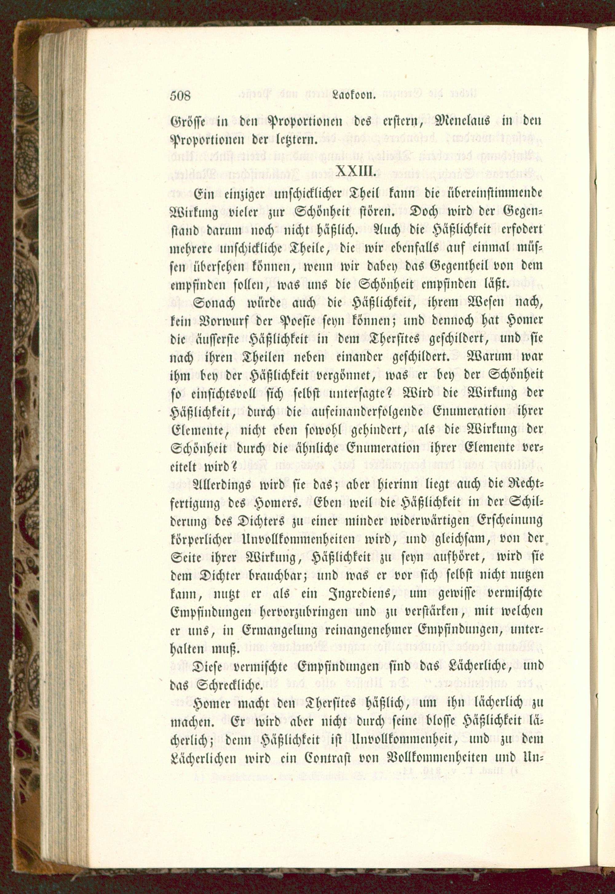 Sonach würde mich die Häßlichkeit, ihrem Wesen nach,kein Vorwurf der Poesie seyn können; und dennoch hat Homer die äusserste Häßlichkeit in dem Thcrsitcs geschildert, und sienach ihren Theilen neben einander geschildert. Warum warihm bey der Häßlichkeit vergönnet, was er bey der Schönheitso einsichtsvoll sich selbst untersagte? Wird die Wirkung derHäßlichkeit, durch die aufeinanderfolgende Enumcration ihrerElemente, nicht eben sowohl gehindert, als die Wirkung derSchönheit durch die ähnliche Enumcration ihrer Elemente ver-eitelt wird?