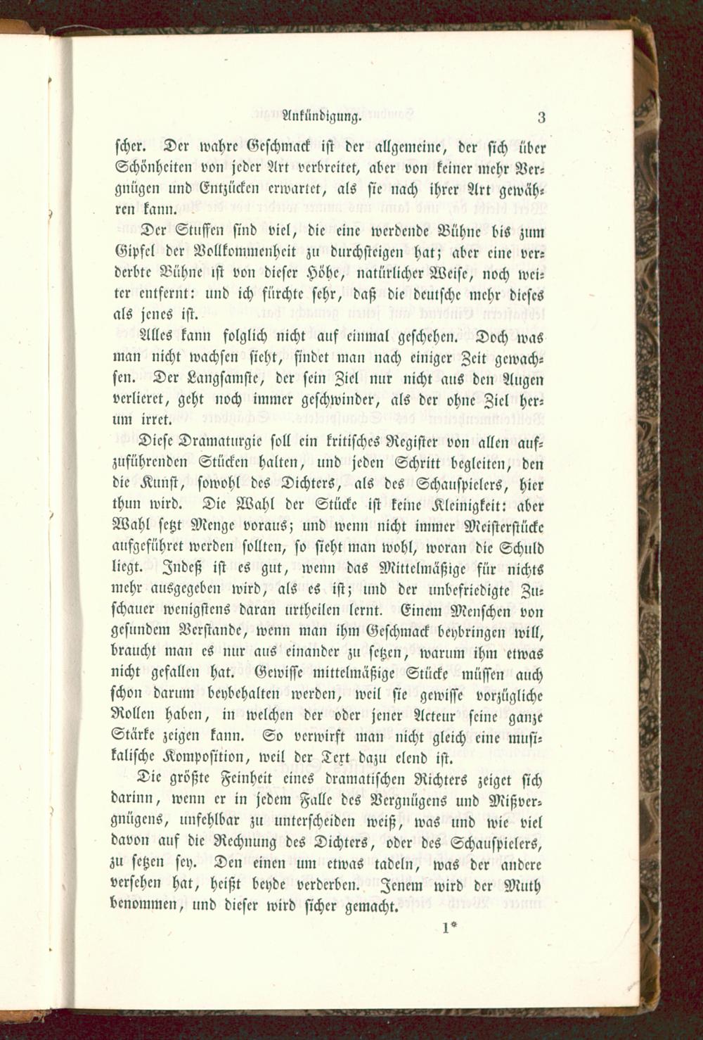 Diese Dramaturgie soll ein kritisches Register von allen auf-zuführenden Stücken halten, und jeden Schritt begleiten, dendie Kunst, sowohl des Dichters, als des Schauspielers, hierthun wird. Die Wahl der Stücke ist keine Kleinigkeit: aberWahl setzt Menge voraus; und wenn nicht immer Meisterstückeausgeführet werden sollten, so sieht man wohl, woran die Schuldliegt. Indeß ist es gut, wenn das Mittelmäßige für nichtsmehr ausgegeben wird, als es ist; und der unbefriedigte Zu-schauer wenigstens daran urtheilen lernt. Einem Menschen vongesundem Verstände, wenn man ihm Geschmack beybringen will,braucht man es nur aus einander zu setzen, warum ihm etwasnicht gefallen hat. Gewisse mittelmäßige Stücke müssen auchschon darum beybehalten werden, weil sie gewisse vorzüglicheRollen haben, in welchen der oder jener Actcur seine ganzeStärke zeigen kann. So verwirft man nicht gleich eine musi-kalische Komposition, weil der Tcrt dazu elend ist.