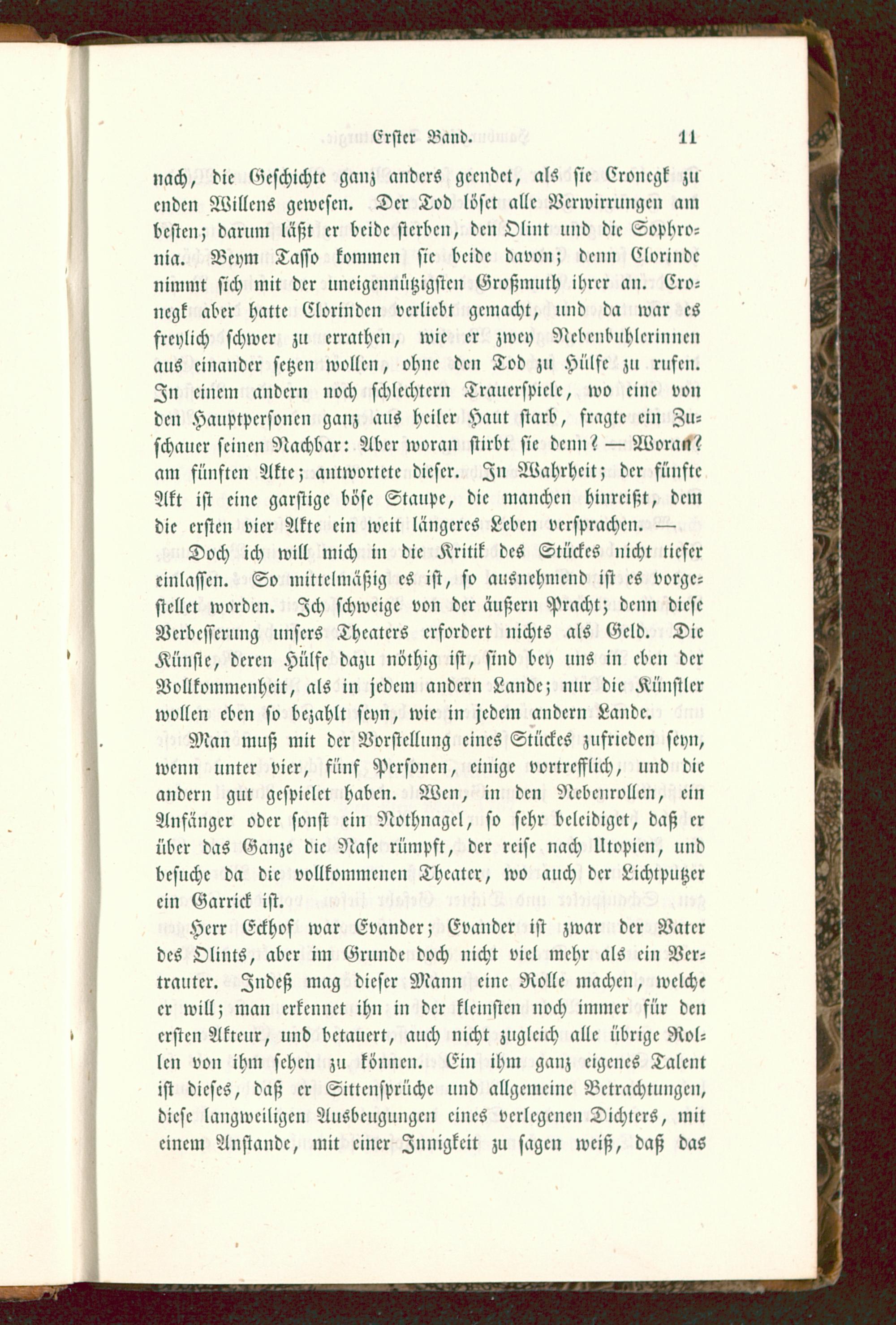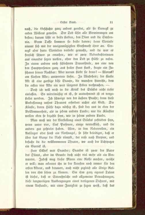 Man muß mit der Vorstellung eines Stückes zufrieden seyn,wenn unter vier, fünf Personen, einige vortrefflich, und dieandern gut gcspielct haben. Wen, in den Nebenrollen, einAnfänger oder sonst ein Nothnagcl, so sehr beleidiget, daß erüber das Ganze die Nase rümpft, der reise nach Utopien, undbesuche da die vollkommenen Theater, wo auch der Lichtputzcrein Garrick ist.