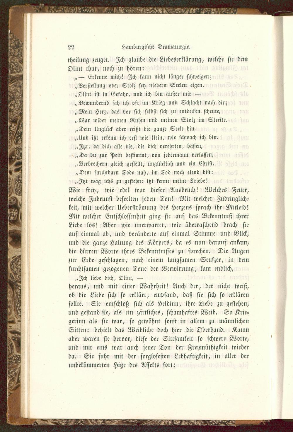 „— Erkenne mich! Ich kann nicht länger schweigen;„Verstellung oder Slolj sey niedern Seelen eigen.„Olint ist in Gefahr, und ich bin außer mir —„Bewundernd sah ich oft im Krieg und Schlacht nach dir;„Mein Herz, das vor sich selbst sich zu entdecken scheute,„War wider meinen Ruhm und meinen Stolz im Streite.„Dein Unglück aber reißt die ganze Seele hin,„lind itzt erkenn ich erst wie klein, wie schwach ich bin.„Jtzt, da dich alle die, die dich verehrten, hassen,„Da du zur Pein bestimmt, von jedermann verlassen,„Verbrechern gleich gestellt, unglücklich und ein Christ,„Dem furchtbar» Tode nah, im Tod noch elend bist:„Jtzt wag ichs zu gestehn: itzt kenne meine Triebe!Wie frey, wie edel war dieser Ausbruch! Welches Feuer,welche Inbrunst beseelten jeden Ton! Mit welcher Zudringlich-keit, mit welcher Ucbcrströmung des Herzens sprach ihr Mitleid!Mit welcher Entschlossenheit ging sie auf das Bekenntniß ihrerLiebe los! Aber wie unerwartet, wie überraschend brach sieauf einmal ab, und veränderte auf einmal Stimme und Blick,und die ganze Haltung des Körpers, da es nun darauf ankam,die dürren Worte ihres Bekenntnisses zu sprechen. Die Augenzur Erde geschlagen, nach einem langsamen Seufzer, in demfurchtsamen gezogenen Tone der Verwirrung, kam endlich,