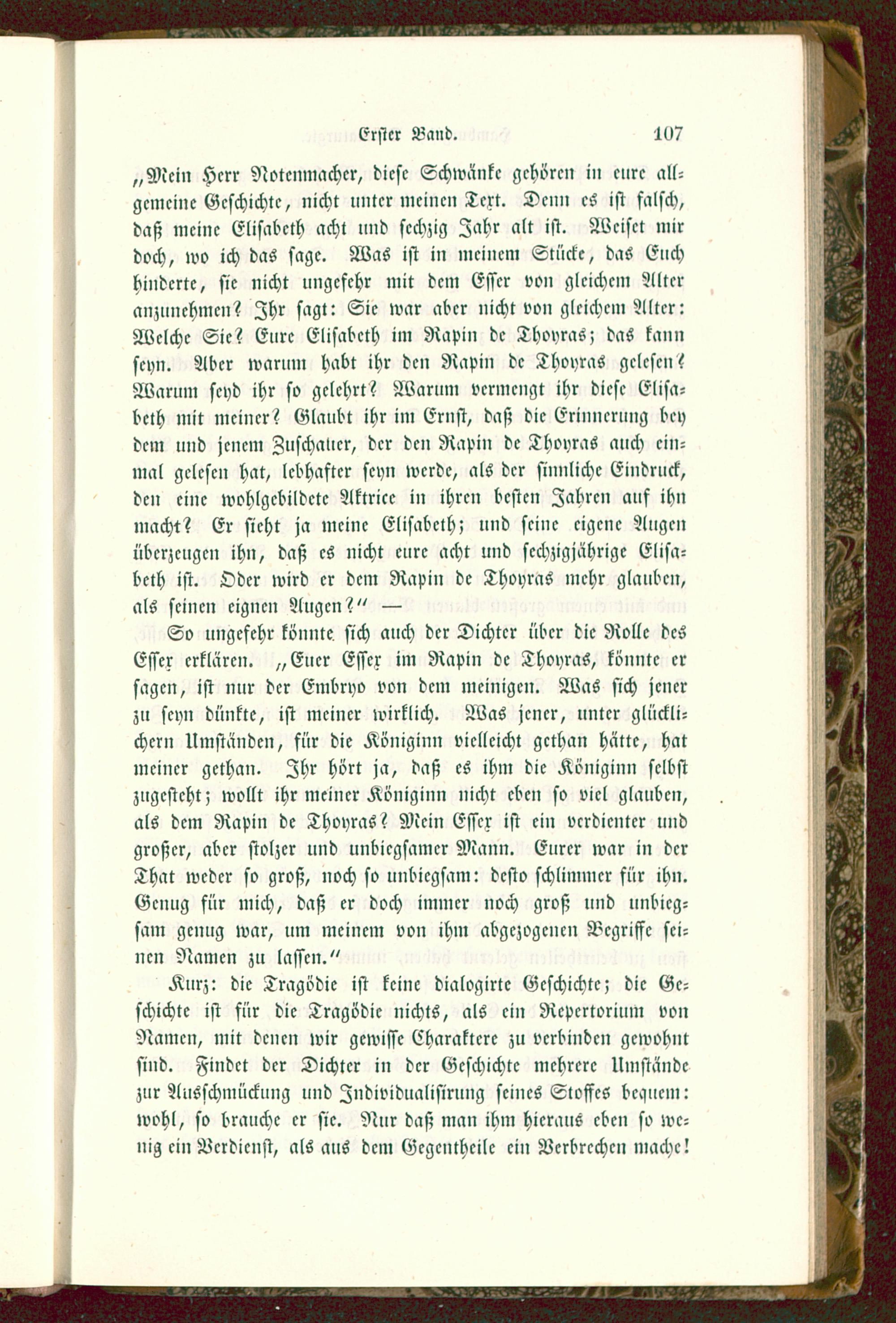 „Mein Herr Notcnmachcr, dicsc Schwanke gehören in eure all-gemeine Geschichte, nicht unter meinen Text. Denn cS ist falsch,daß meine Elisabeth acht und sechzig Zahr alt ist. Weiset mirdoch, wo ich das sage. Was ist in meinem Stücke, das Euchhinderte, sie nicht ungefehr mit dem Esser von gleichem Alteranzunehmen? Ihr sagt: Sie war aber nicht von gleichem Alter:Welche Sie? Eure Elisabeth im Napin de Thoyras; das kannseyn. Aber warum habt ihr den Rapin de Thoyras gelesen?Warum seyd ihr so gelehrt? Warum vermengt ihr dicsc Elisa-beth mit meiner? Glaubt ihr im Ernst, daß die Erinncrung beydem und jenem Zuschalicr, der den Rapin de Thoyras auch ein-mal gelesen hat, lebhafter seyn werde, als der sinnliche Eindruck,den eine wohlgcbildctc Aktrice in ihren bcstcn Zahrcn auf ihnmacht? Er ficht ja mcinc Elisabeth; und seine eigene Augenüberzeugen ihn, daß es nicht eure acht und scchzigjährige Elisa-beth ist. Oder wird er dem Rapin de Thoyras mehr glauben,als seinen eignen Augen?" —