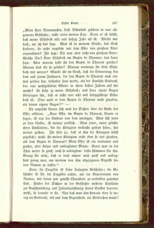 So ungefehr könnte sich auch der Dichter über die Rolle desEsser erklären. „Euer Esser im Rapin de Thoyras, könnte ersagen, ist nur der Embryo von dem mcinigen. Was sich jenerzu seyn dünkte, ist meiner wirklich. Was jener, unter glückli-chern Umständen, für die Königinn vielleicht gethan hätte, hatmeiner gethan. Ihr hört ja, daß es ihm die Königinn selbstzugesteht; wollt ihr meiner Königinn nicht eben so viel glauben,als dem Rapin de Thoyras? Mein Esser ist ein verdienter undgroßer, aber stolzer und unbicgsamcr Mann. Eurer war in derThat weder so groß, noch so unbicgsam: desto schlimmer für ihn.Genug für mich, daß er doch immer noch groß und unbicg-sam genug war, um meinem von ihm abgezogenen Begriffe sei-nen Namen zu lassen."