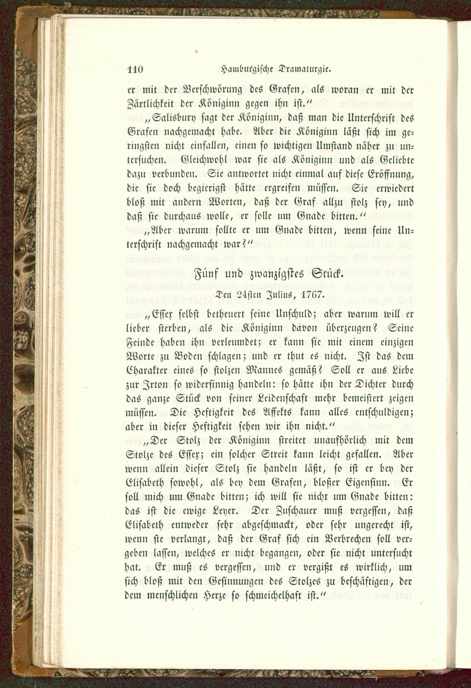 „Der Stolz der Königinn streitet unaufhörlich mit demStolze des Esscx; ein solcher Streit kann leicht gefallen. Aberwenn allein dieser Stolz sie handeln läßt, so ist er bey derElisabeth sowohl, als bey dem Grafen, bloßer Eigensinn. Ersoll mich um Gnade bitten; ich will sie nicht um Gnade bitten:das ist die ewige Lcyer. Der Zuschauer muß vergessen, daßElisabeth entweder sehr abgeschmackt, oder sehr ungerecht ist,wenn sie verlangt, daß der Gras sich ein Verbrechen soll ver-geben lassen, welches er nicht begangen, oder sie nicht untersuchthat. Er muß es vergessen, und er vergißt es wirklich, umsich bloß mit den Gesinnungen des Stolzes zu beschäftigen, derdem menschlichen Herze so schmeichelhaft ist."