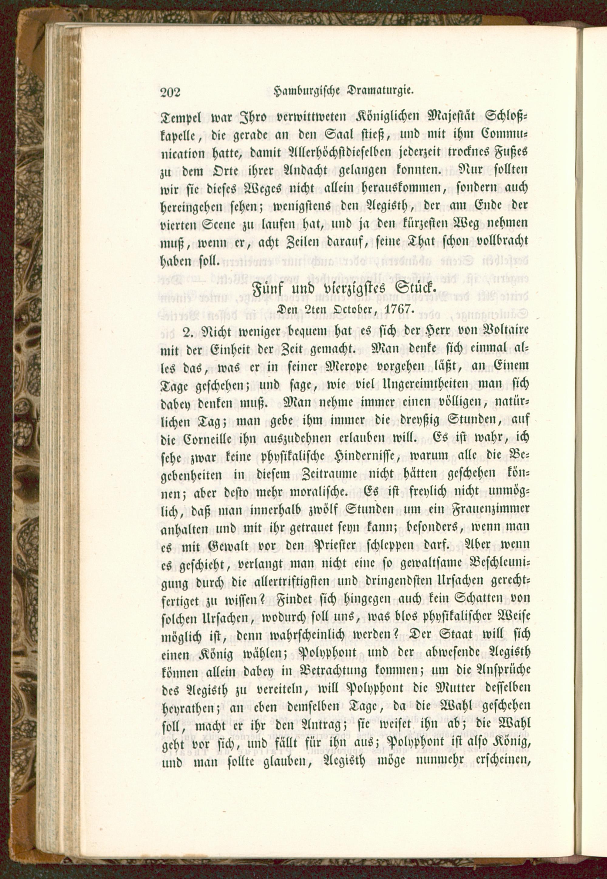 Den 2tcn Oktober, 1767.2. Nicht weniger bequem hat es sich der Herr von Voltaire mit der Einheit der Zeit gemacht. Man denke sich einmal al-les das, was er in seiner Mcrope vorgehen läßt, an EinemTage geschehen; und sage, wie viel Ungereimtheiten man sichdabey denke» muß. Man nehme immer einen völlige», natür-liche» Tag; man gebe ihm immer die dreyßig Stunden, aufdie Eorncillc ihn auszudehnen erlauben will. Es ist wahr, ichsehe zwar keine physikalische Hindernisse, warum alle die Be-gebenheiten in diesem Zeiträume nicht hätten geschehen kön-nen; aber desto mehr moralische. Es ist freylich nicht unmög-lich, daß man innerhalb zwölf Stunden um ein Francnzimmeranhalten und mit ihr getrauet seyn kann; besoiiders, wen» ma»cs mit Gewalt vor den Priester schleppen darf. Aber wennes geschieht, verlangt man nicht eine so gewaltsame Beschleuni-gung durch die allertriftigstcn und dringendsten Ursachen gcrccht-scrtigct zu wissen? Findet sich hingcgcn auch kein Schatten vonsolche» Ursachen, wodurch soll uns, was blos physikalischer Weisemöglich ist, denn wahrscheinlich werden? Der Staat will sicheinen König wählen; Polyphont und der abwesende Acgisthkönnen allein dabey in Betrachtung kommen; um die Ansprüchedes Acgisth zu vereiteln, will Polyphont die Mutter desselbenhcyrathcn; an eben demselben Tage, da die Wahl geschehensoll, macht cr ihr den Antrag; sie weiset ihn ab; die Wahlgcht vor sich, und fällt für ihn aus; Polyphont ist also König,und man sollte glauben, Acgisth möge nunmchr erscheinen,