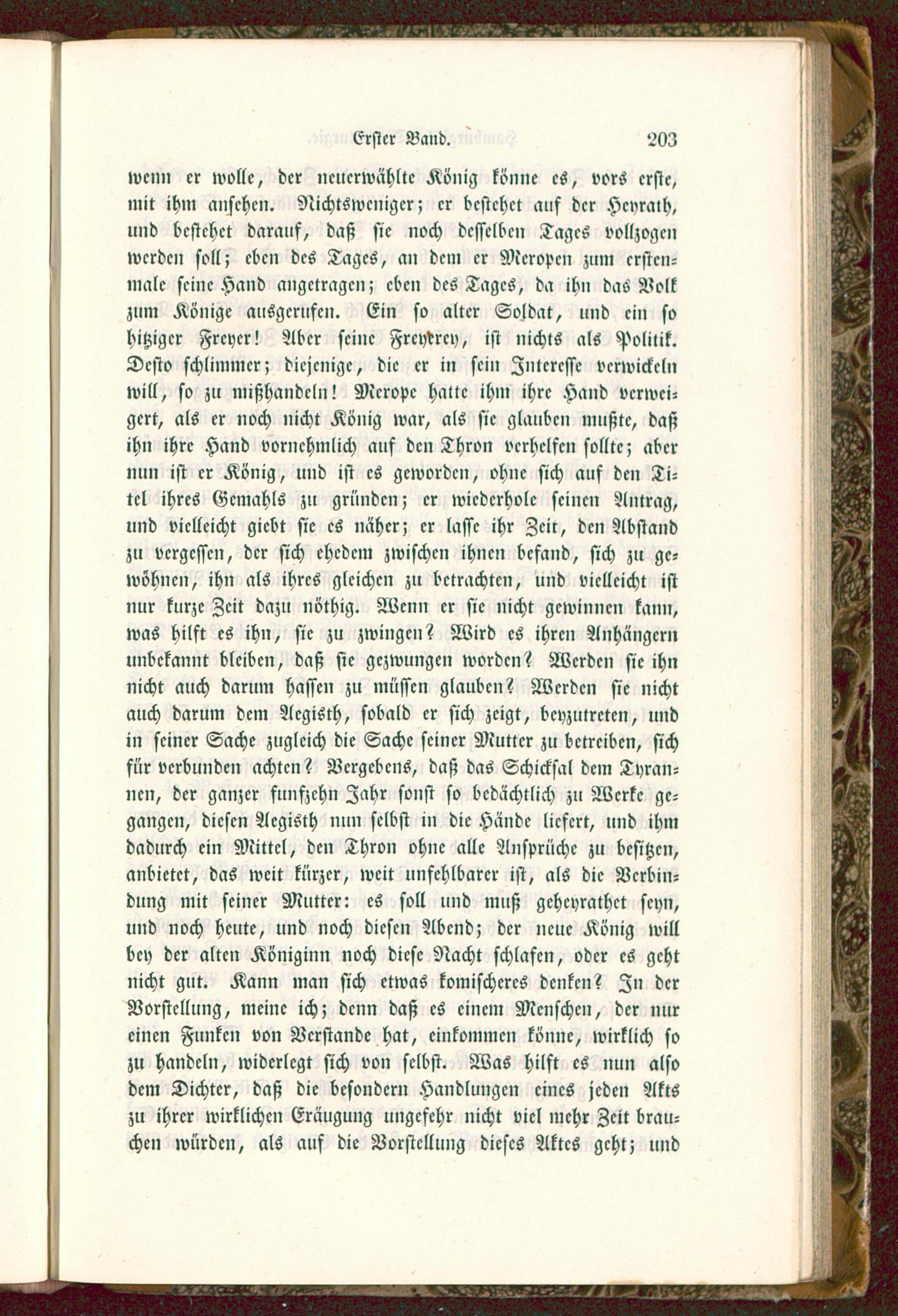 wenn er wolle, der ncucrwähltc König könne es, vors erste,mit ihm anschcn. Nichtswcnigcr; er bestehet auf der Hcyralh,und bestehet darauf, daß sie noch desselben Tages vollzogenwerden soll; eben des Tages, an dem er Mcropcn zum ersten-male seine Hand angetragen; eben des Tages, da ihn das Volkzum Könige ausgerufen. Ein so alter Soldat, und ein sohitziger Freyer! Aber seine Freyrrcy, ist nichts als Politik.Desto schlimmer; diejenige, die er in sei» Interesse verwickelnwill, so zu mißhandeln! Mcrope halte ihm ihre Hand verwei-gert, als er noch nicht König war, als sie glauben mußte, daßihn ihre Hand vornehmlich auf den Thron verhelfen sollte; abernun ist er König, und ist es geworden, ohne sich auf den Ti-tel ihres Gemahls zu gründen; er wiederhole seinen Antrag,und vielleicht giebt sie es näher; er lasse ihr Zeit, den Abstandzu vergessen, der sich ehedem zwischen ihnen befand, sich zu ge-wöhnen, ihn als ihres gleichen zu betrachten, und vielleicht istnur kurze Zeit dazu nöthig. Wenn er sie nicht gewinnen kann,was hilft es ihn, sie zu zwingen? Wird es ihren Anhängernunbekannt bleiben, daß sie gezwungen worden? Werden sie ihnnicht auch darum hassen zu müssen glauben? Werden sie nichtauch darum dem Acgisth, sobald er sich zeigt, beyzutreten, undin seiner Sache zugleich die Sache seiner Mutter zu betreiben, sichfür verbunden achten? Vergebens, daß das Schicksal dem Tyran-nen, der ganzer funszchn Zahr sonst so bcdächtlich zu Werke ge-gangen, diesen Aegisth nun selbst in die Hände liefert, und ihmdadurch ein Mittel, den Thron ohne alle Ansprüche zu besitzen,anbietet, das weit kürzer, weit unfehlbarer ist, als die Verbin-dung mit seiner Mutter: es soll und muß gchcyrathct seyn,und noch heute, und noch diesen Abend; der neue König willbey der alten Königinn noch diese Nacht schlafen, oder es gehtnicht gut. Kann man sich etwas komischeres denken? In derVorstellung, meine ich; denn daß es einem Menschen, der nureinen Funken von Verstände hat, einkommen könne, wirklich sozu handeln, widerlegt sich von selbst. Was hilft es nun alsodem Dichter, daß die besondern Handlungen eines jeden Aktszu ihrer wirklichen Eräugung ungefehr nicht viel mehr Zeit brau-chen würden, als auf die Vorstellung dieses Aktes geht; und