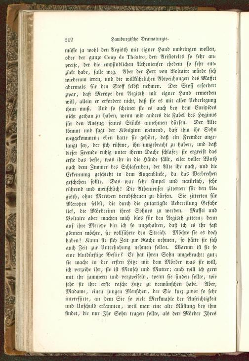 müsse ja wohl den Acgisth mit eigner Hand umbringen wollen,oder der ganze K«n>n ,ko l'lx'atro, den Aristoteles so sehr an-preise, der die empfindlichen Athcnicnscr ehedem so sehr ent-zückt habe, falle weg. Aber der Herr von Voltaire würde sichwiederum irren, und die willkührlichcn Abweichungen des Maffciabermals für den Stoff selbst nehmen. Der Stoff erfordertzwar, daß Mcropc den Acgisth mit eigner Hand ermordenwill, allci» cr erfordert nicht, daß sie es mit aller Ucbcrlegungthun muß. 1I»d so scheinet sie es auch bey dem Euripidcsnicht gethan zu haben, wenn wir anders die Fabel des Hyginusfür den Auszug seines Stücks annehmen dürfen. Der Altekommt und sagt der Königinn weinend, daß ihm ihr Sohnweggekommen; eben hatte sie gehört, daß ein Fremder ange-langt sey, der sich rühme, ihn umgebracht zu haben, und daßdieser Fremde ruhig unter ihrem Dache schlafe; sie ergreift daserste das beste, was ihr in die Hände fällt, eilet voller Wuthnach dem Zimmer des Schlafenden, der Alte ihr nach, und dieErkennung geschieht in dem Augenblicke, da das Verbrechengeschehen sollte. Das war sehr simpel und natürlich, sehrrührend und menschlich! Die Athenienscr zitterten für den Ae-gisth, ohne Meropcn verabscheuen zu dürfen. Sie zitterten fürMcropcn selbst, die durch die gutartigste Uebercilung Gefahrlief, die Mörderinn ihres Sohnes zu werden. Maffei undVoltaire aber machen mich blos für den Acgisth zittern; dennauf ihre Mcrove bin ich so ungehalten, daß ich es ihr fastgönnen möchte, sie vollführte den Streich. Möchte sie es dochhabe»! Kann sie sich Zeit zur Rache nehmen, so hätte sie sichauch Zeit zur Untersuchung nehmen sollen. Warum ist sie soeine blutdürstige Bestie? Er hat ihren Sohn umgebracht: gut;sie mache in der ersten Hitze mit dem Mörder was sie will,ich verzeihe ihr, sie ist Mensch und Mutter; auch will ich gcrnmit ihr jammcrn und verzweifeln, wenn sie finden sollte, wiesehr sie ihre erste rasche Hitze zu verwünschen habe. Aber,Madame, einen jungen Mcnschcn, der Sie kurz zuvor so sehrintcrcssiltc, an dem Sie so viele Merkmahle der Aufrichtigkeitund Unschuld crkannlcn, wcil man cinc alte Rüstung bey ihmfindet, die nur Ihr Sohn tragen sollte, als den Mörder Ihres