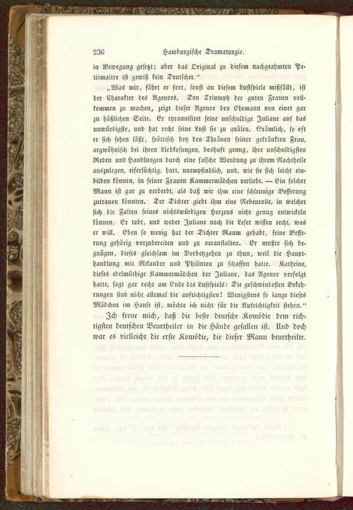 „WaS mir, fährt er fort, sonst an diesem Lustspiele mißfällt, istder Charakter des Agenors. Den Triumph der guten Frauen voll-kommen zu machen, zeigt dieser Agenor den Ehemann von einer garzn häßlichen Seite. Er tyrannisiret seine unschuldige Juliane auf dasunwürdigste, und hat recht seine Lust sie zu quälen. Grämlich, so ofter sich sehen läßt, spöttisch bey den Thränen seiner gekränkten Frau,argwöhnisch bei ihren Liebkosungen, boshaft genug, ihre unschuldigstenReden und Handlungen durch eine falsche Wendung zu ihrem Nachtheileauszulegen, eifersüchtig, hart, unempfindlich, und, wie sie sich leicht ein-bilden können, in seiner Frauen Kammermädchen verliebt. — Ein solcherMann ist gar zu verderbt, als daß wir ihm eine schleunige Besserungzutraue» könnten. Der Dichter giebt ihm eine Rebenrolle, in welchersich die Falten seines nichtswürdigcn Herzens nicht genug entwickelnkönnen. Er lobt, und weder Juliane noch die Leser wissen recht, waser will. Eben so wenig hat der Dichter Raum gehabt, seine Besse-rung gehörig vorzubereiten und zu veranstalten. Er mußte sich be-gnügcn, dieses gleichsam im Vorbeygehen zu thun, weil die Haupt-haudluug mit Nikaudcr und Philintcn zu schaffen hatte. Kathrine,dieses edelmüthigc Kamuiermädchen der Juliane, das Agenor verfolgthatte, sagt gar recht am Ende des Lustspiels: Die geschwindesten Bekeh-rungen sind nicht allemal die aufrichtigsten! Wenigstens so lange diesesMädchen im Hause ist, möchte ich nicht für die Aufrichtigkeit stehen."