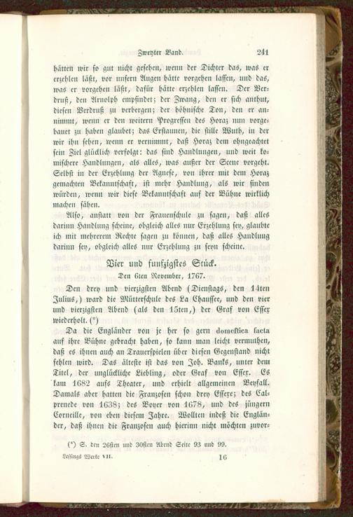 bättc» wir so gut nicht gesehen, wenn der Dichter das, was ercrzeblcn läßt, vor unsern Augen bättc vorgehen lassen, und das,was er vorgehen läßt, dafür hätte crzchlcn lassen. Der Ver-druß, den Aruolpb empfindet; der Zwang, den er sich anthut,diesen Verdruß zu verbergen; der lwbnischc Ton, den er an-nimmt, wenn er den weitem Progresscn des Hora; nun vorge-bauet zu babcu glaubet; das Erstaune», die stille Wutb, in derwir ihn scben, wenn er vernimmt, daß Hora; dem obngcachtctsein Ziel glücklich verfolgt: das sind Handlungen, und weit ko-mischere Handlungen, als alles, was außer der Scene vorgeht.Selbst in der Erzehlung der Agncsc, von ibrcr mit dem Hora;gemachten Bekanntschaft, ist mehr Handlung, als wir findenwürden, wenn wir diese Bekanntschaft auf der Bühne wirklichmachen sahen.