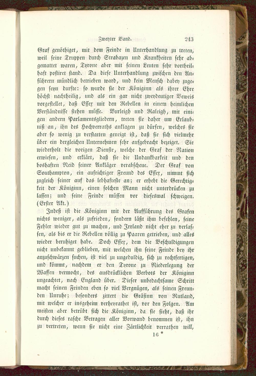 Zndcß ist die Königinn mit der Aufführung des Grafennichts weniger, als zufrieden, sondern läßt ihm befehlen, seineFehler wieder gut zu machen, und Zrrland nicht eher zu verlas-sen, als bis er die Rebellen völlig zu Paaren getrieben, und alleswieder beruhiget habe. Doch Esser, dcm die Beschuldigungennicht unbekannt geblieben, mit welchen ihn seine Feinde bey ihranzuschwärzen suchen, ist viel zu ungeduldig, sich zu rechtfertigen,und kömmt, nachdem er den Tyrone zu Nicderlcgung derWaffen vermocht, des ausdrücklichen Verbots der Königinnungeachtet, nach England über. Dieser unbcdachtsamc Schrittmacht seinen Feinden eben so viel Vergnügen, als seinen Freun-den Unruhe; besonders zittert die Gräfinn von Nutland,mit welcher er insgeheim vcrhcnrathct ist, vor den Folgen. Ammeisten aber betrübt sich die Königinn, da sie sieht, daß ihrdurch dieses rasche Betragen aller Vorwand benommen ist, ihnzu vertreten, wenn sie nicht eine Zärtlichkeit verrathen will,