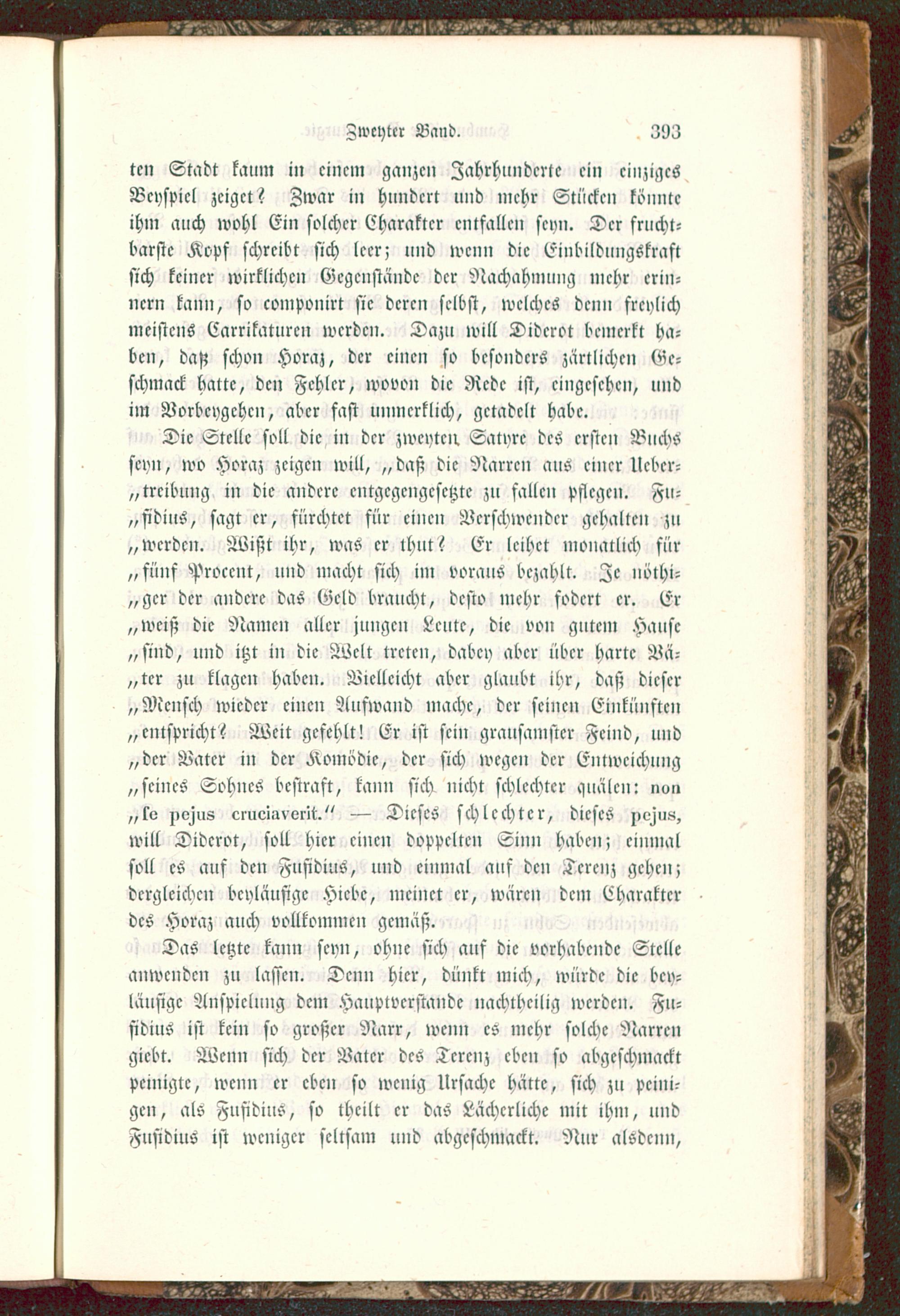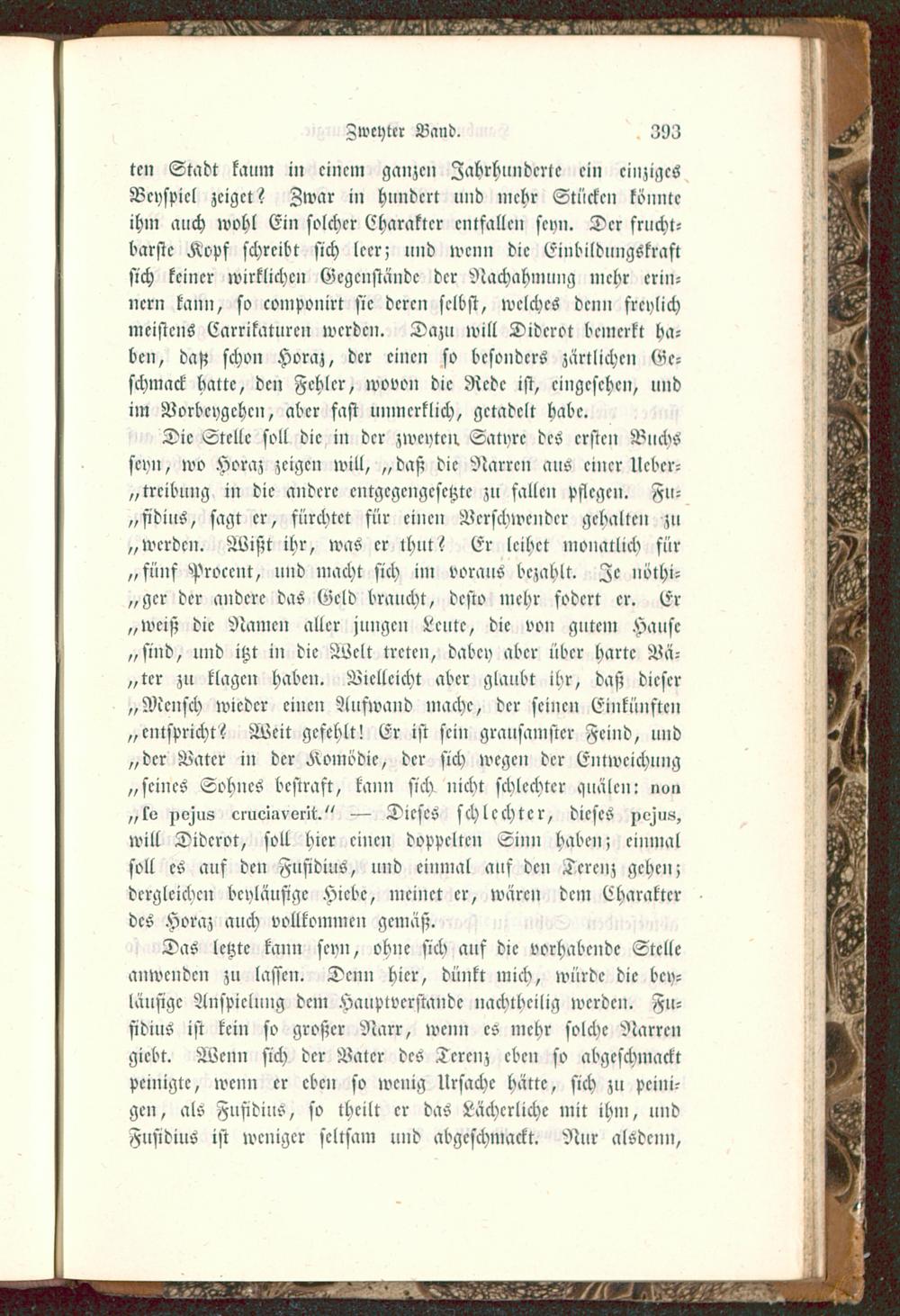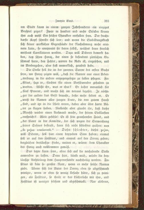 Die Stelle soll die in der zweyten. Satyrc des ersten Buchsseyn, wo Horaz zeigen will, „daß die Narren aus einer Ueber-treibung in die andere entgegengesetzte zu fallen Pflegen. Fu-„fidius, sagt er, fürchtet für einen Verschwender gehalten zu„werden. Wißt ihr, was er thut? Er leihet monatlich für„fünf Proccnt, nnd macht sich im voraus bezahlt. Je nöthi-ger der andere das Geld braucht, desto mehr fodcrt er. Er„weiß die Namen aller jungen Leute, die von gutem Hause„sind, und itzt in die Welt treten, dabey aber über harte Vä-„ter zu klagen haben. Vielleicht aber glaubt ihr, daß dieser„Mensch wieder einen Aufwand mache, der seinen Einkünften„entspricht? Weit gefehlt! Er ist sein grausamster Feind, und„der Vater in der Komödie, der sich wegen der Einweichung„seines Sohnes bestraft, kann sich nicht schlechter auälcn: non„<"<- nvjus cruemvvrit." — Dieses schlechter, dieses nc^ii^,will Diderot , soll hier einen doppelten Sinn haben; einmalsoll es auf den Fufidius, und einmal auf den Tercnz gehen;dergleichen beyläufige Hiebe, meinet er, wären dem Charakterdes Horaz auch vollkommen gemäß.