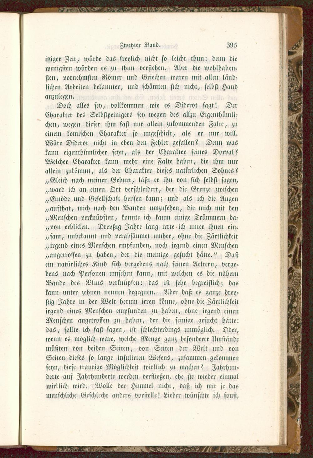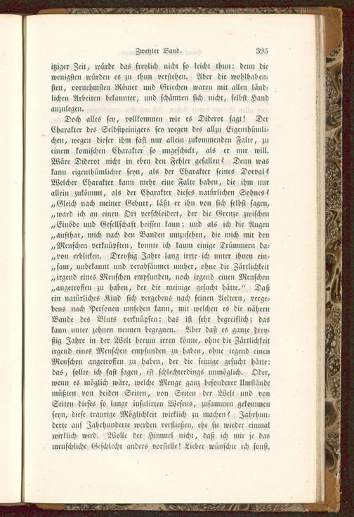 Doch alles sey, vollkommen wie es Diderot sagt! DerCharakter des Sclbstpcinigcrs sey wegen des allzu Eigenthümli-chen, wegen dieser ihm fast nur allein zukommende» Falte, zueinem komischen Charakter so ungeschickt, als er nur will.Wäre Diderot nicht in eben den Fehler gefallend Denn waskann eigenthümlicher seyn, als der Charakter seines Dorval?Welcher Charakter kann mehr eine Falte haben, die ihm nurallein zukömmt, als der Charakter dieses natürlichen Sohnes?„Gleich nach meiner Geburt, läßt er ihn von sich selbst sagen,„ward ich an einen Ort vcrschlcidcrt, der die Grenze zwischen„Einöde und Gesellschaft hcisscn kann; und als ich die Augen„aufthat, mich nach den Banden umzusehen, die mich mit den„Menschen verknüpften, konnte ich kaum einige Trümmern da-„von erblicken. Dreyßig Zahre lang irrte ich unter ihnen cin-„sam, unbekannt und verabsäumet umher, ohne die Zärtlichkeit„irgend eines Menschen empfunden, noch irgend einen Menschen„angetroffen zu haben, der die meinigc gesucht hätte." Daßein natürliches Kind sich vergebens nach seinen Ackern, verge-bens nach Personen umsehen kann, mit welchen es die nähernBande des Bluts verknüpfen: das ist sehr begreiflich; daskann unter zehnen ncunen begegnen. Aber daß es ganze drey-ßig Zahre in der Welt herum irren könne, ohne die Zärtlichkeitirgend eines Menschen empfunden zu haben, ohne irgend einenMenschen angetroffen zu haben, der die scinige gesucht hätte:das, sollte ich fast sagen, ist schlechterdings unmöglich. Oder,wenn es möglich wäre, welche Menge ganz besonderer Umständemüßten von beiden Seiten, von Seiten der Welt und vonSeiten dieses so lange insulirtcn Wesens, zusammen gekommenseyn, diese traurige Möglichkeit wirklich zu machen? Jahrhun-derte auf Jahrhunderte werden verfließen, ehe sie wieder einmalwirtlich wird. Wolle der Himmel nicht, daß ich mir je dasmenschliche Geschlecht anders vorstelle! Lieber wünschte ich sonst.