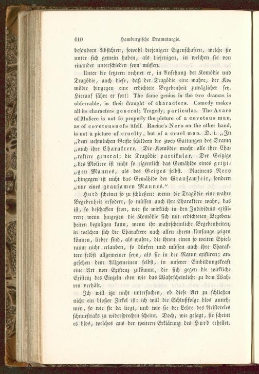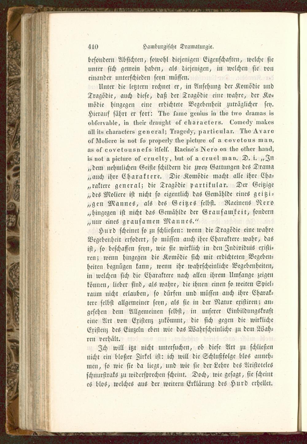 Unter die letzter» rechnet er, in Ansehung der Komödie undTragödie, auch diese, daß der Tragödie eine wahre, der Ko-mödie hingegen eine erdichtete Begebenheit zuträglicher se>).Hierauf fahrt cr fort: lliv l'unio Fonius i„ tlio t»vo «lianias isoI>lV>rv!>I)Ie, i» llieir lU'iniglit vf clioraetors. l^omoclv makesilll it-, eli.iraetors Foi> vraI; l'i»FOtl^, ^> artiouIar. ^tiv ^ vaiovfklulivrv is not s» nronort^ tlie ^>ieturv of u oovvtous man,as of covotousnvks ittolf. Iiaei»o's I^vro «n tliv otlier Iiüiill,is not a ziicturo ok cruolt^, liut ol s cruvl man. D. i. ,,Z»„dem nehmliche» Geiste schildern die zwey Gattungen des Drama„auch ihre Charaktere. Die Komödie macht alle ihre Cha-raktere gciicral; die Tragödie partikular. Der Gcitzigc„des Molicrc ist nicht so eigentlich das Gcmahldc eines geitzi-„gcn Mannes, als dcs Gcitzes selbst. Nacincns Nero„hingegen ist nicht das Gemählde der Grausamkeit, sondern„nur cincs grausamen Mannes."