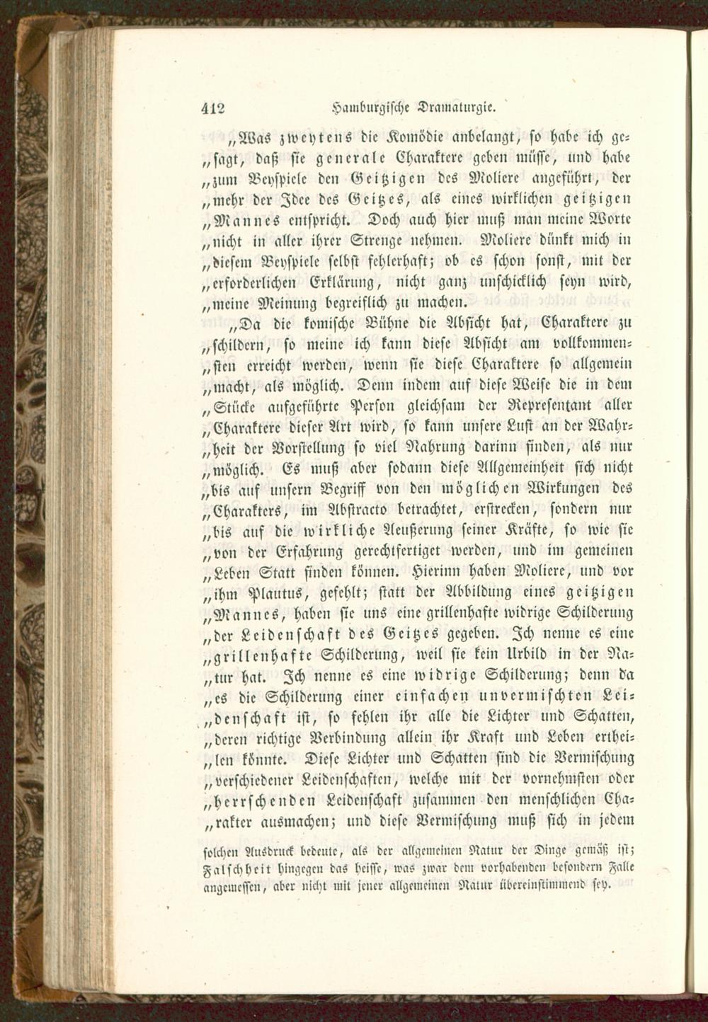 „Da die komische Bühne die Absicht hat, Charaktere zu„schildern, so meine ich kann diese Absicht am vollkommen-em erreicht werden, wenn sie diese Charaktere so allgemein„macht, als möglich. Denn indem auf diese Weise die in dem„Stücke aufgeführte Person gleichsam der Ncprcscntant aller„Charaktere dieser Art wird, so kann unsere Lust an der Wahr-heit der Vorstellung so viel Nahrung darinn finden, als nur„möglich. Es muß aber sodann diese Allgemeinheit sich nicht„bis auf unsern Begriff von den möglichen Wirkungen des„Charakters, im Abstracto betrachtet, erstrecken, sondern nur„bis auf die wirkliche Aeußerung seiner Kräfte, so wie sie„von der Erfahrung gercchlfcrtigct werden, und im gemeinen„Leben Statt finden können. Hierum haben Molicrc, und vor„ihm Plautus , gefehlt; statt der Abbildung eines geitzigcn„Mannes, haben sie uns eine grillenhafte widrige Schilderung„der Leidenschaft des Gcitzes gegeben. Ich nenne es eine„grillenhafte Schilderung, weil sie kein Urbild in der Na-„tur hat. Ich nenne es eine widrige Schilderung; denn da„es die Schilderung einer einfachen unvcrmischten Lei-denschaft ist, so fchlcn ihr alle die Lichter und Schatten,„deren richtige Verbindung allein ihr Kraft und Leben erthei-len könnte. Diese Lichter und Schatten sind die Vermischung„verschiedener Leidenschaften, welche mit der vornehmsten oder„herrschenden Leidenschaft zusammen den menschlichen Cha-rakter ausmachen; und diese Vermischung muß sich in jedem