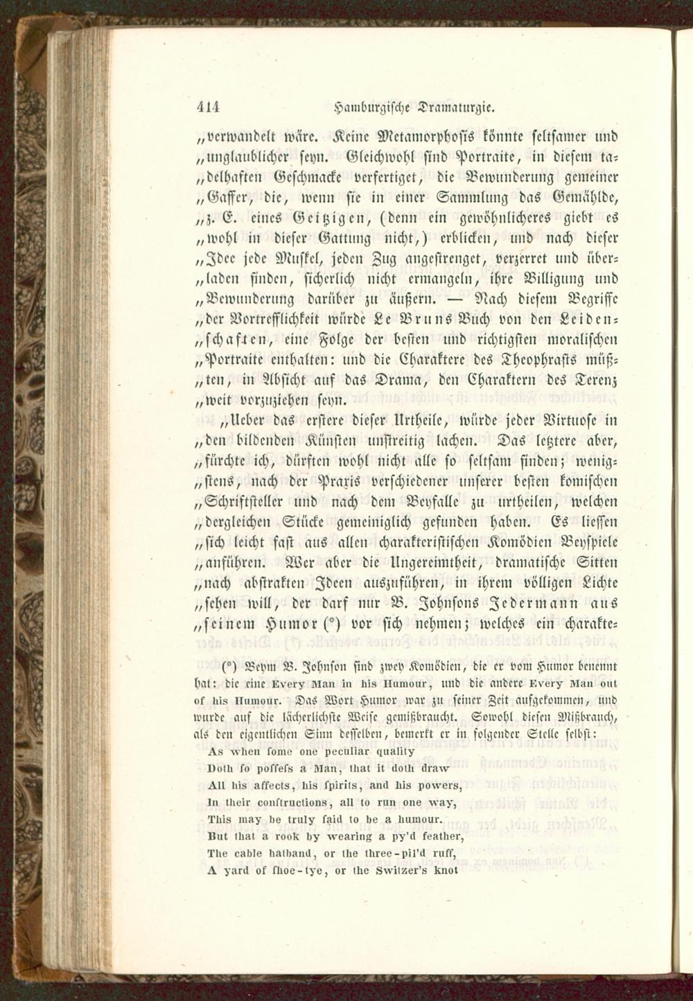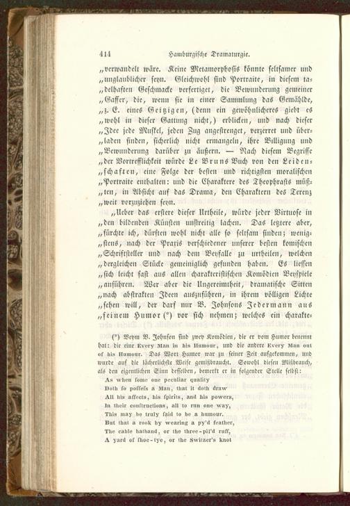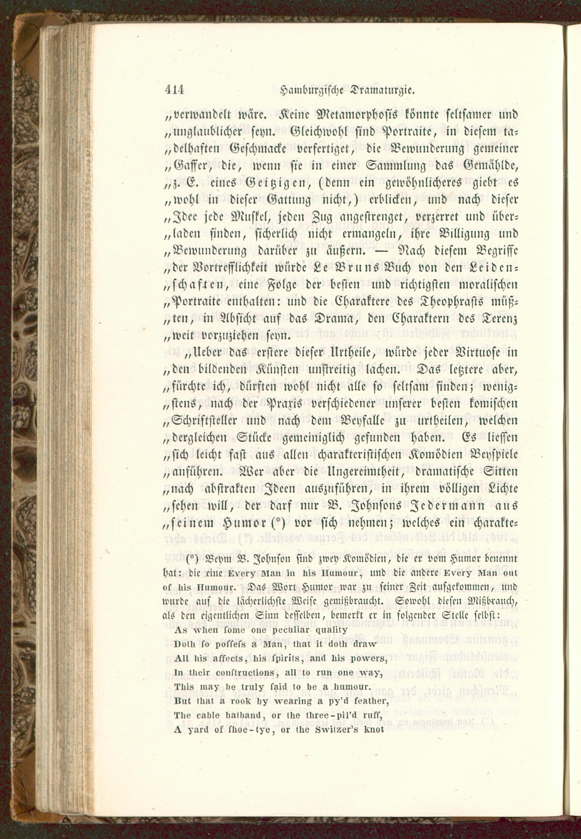 „Ueber das erstere dieser Urtheile, würde jeder Virtuose in„den bildenden Künsten unstreitig lachen. Das letztere aber,„fürchte ich, dürften wohl nicht alle so seltsam finden; wcnig-„stcns, nach der Praris verschiedener unserer besten komischen„Schriftsteller und nach dem Bcyfallc zu urtheilen, welchen„dergleichen Stücke gemeiniglich gefunden haben. Es liessen„sich leicht fast aus allen charakteristischen Komödien Beyspiele„ansührcn. Wer aber die Ungereimtheit, dramatische Sitten„nach abstrakten Zdccn auszuführen, in ihrem völligen Lichte„sehen will, der darf nur B. Johnsons Jedermann aus„seinem Humor (°) vor sich nehmen; welches ein charaktc-