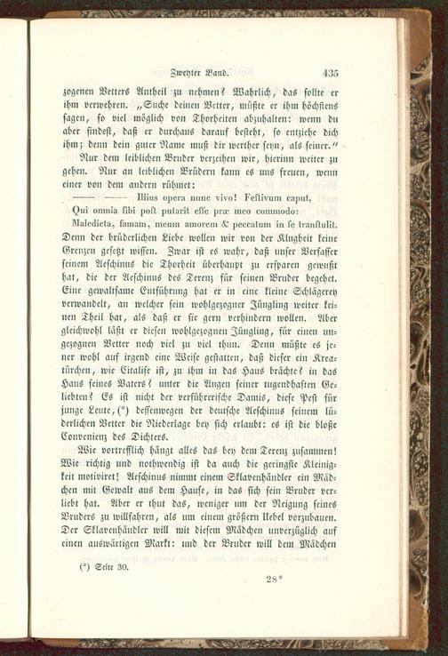 ^)ui omnla kilii >>ost ^>ut!>ril. eklv n>'!L meo cuminoilo:ülaleilicta, lamam, mvinn nmoiem zie^ciUiim in 5e Ii.i»i>i>IiI.Denn der brüderlichen Liebe wollen wir von der Klugheit keineGrenzen gesetzt wissen. Zwar ist es wahr, daß nnscr Verfasserseinem Acschinns die Thorheit überhaupt zu ersparen gewußthat, die der Acschinus des Tcrenz für seinen Bruder begehet.Eine gewaltsame Entführung hat cr in eine kleine Schlägcrcyverwandelt, an welcher sein wohlgczogncr Jüngling wcitcr kei-nen Theil hat, als daß cr sic gcrn verhindern wollen. Abergleichwohl läßt er diesen wohlgczogncn Jüngling, für einen un-gczogncn Vcttcr noch viel zu viel thun. Denn müßte es je-ner wohl auf irgend eine Weise gestatten, daß dieser ein Krca-türchcn, wie Citalise ist, zu ihm in das Haus brächte? iu dasHaus seines Vaters? unter die Augen seiner tugendhaften Ge-liebten? Es ist nicht der verführerische Damis, diese Pest fürjunge Leute, (°) dcsscnwcgcn der deutsche Acschinus seinem lü-dcrlichcn Vcttcr die Niederlage bey sich erlaubt: es ist die bloßeConvcnicnz des Dichters.