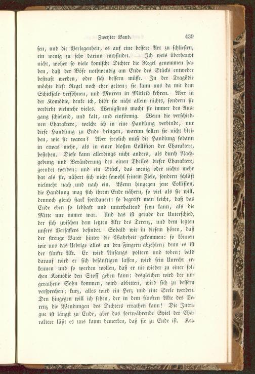 scn, lind dic Vcrlcgcnbcit, es auf cinc bessere Art zu schließen,ein wenig zu sehr dann» empfindet. — Ich weis überbauptnicht, woher so viele komische Dichter dic Regel genommen ha-ben, daß der Böse nothwendig am Ende des Stücks entwederbestraft werden, oder sich bessern müsse. In der Tragödiemöchte diese Regel noch eher gelten; sie kann uns da mit demSchicksale versöhnen, und Murren in Mitleid kehren. Aber inder Komödie, denke ich, hilft sie nicht allein niä'ts, sondern sieverdirbt vielmehr vieles. Wenigstens macht sie immer den Aus-gang sckielcnd, und kalt, und einförmig. Wenn dic vcrschied-ncn Charaktere, welche ich in cinc Handlung verbinde, mirdiese Handlung zn Ende bringen, warum sollen sie nicht blei-ben, wie sie waren? Aber freylich muß dic Handlung sodannin ctwas mehr, als in einer bloßen Kollision der Charaktere,bestehen. Diese kann allerdings nicht anders, als durch Nach-gcbung und Veränderung des cinc» Tbcilcs dieser Charaktere,geendet werden; und ein Stück, das wenig oder nichts mebrhat als sie, nähert sich nicht sowohl seinem Ziele, sondern schläftvielmehr nach, und nach ein. Wenn hingegen jene Collision,dic Handlnng mag sich ihrcm Ende nähern, so viel als sie will,dennoch gleich stark fortdauert: so begreift man leicht, daß dasEnde eben so lebhaft und unterhaltend seyn kann, als dieMitte nur immer war. Und das ist gerade der Unterschied,der sich zwischen dem letzten Akte des Tcrcnz, nnd dem letztenunsers Verfassers befindet. Sobald wir in diesem hören, daßder strenge Vater hinter die Wahrheit gekommen: so könnenwir uns das Ucbrigc alles an den Fingern abzchlcn; denn es istder fünfte Akt. Er wird Anfangs poltern und toben; balddarauf wird er sich besänftigen lassen, wird sein Unrecht er-kennen und so werden wollen, daß er nie wieder zu einer sol-chen Komödie den Stoff geben kann: desgleichen wird der un-gcralhcne Sohn kommen, wird abbittcn, wird sich zu bessernversprechen; kurz, allcs wird ein Herz und cinc Scclc werden.Den hingegen will ich sehen, der in dem fünften Akte des Tc-rcnz die Wendungen des Dichters crratbcn kann! Dic Intri-gue ist längst zu Ende, aber das fortwährende Spiel der Cha-raktere läßt es uns kaum bemerken, daß sie zu Cndc ist. Kei.