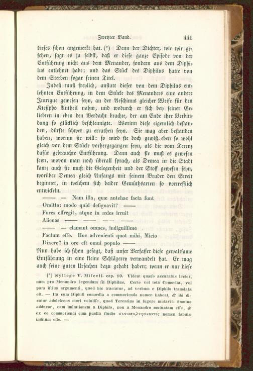 Indeß muß freylich, anstatt dieser von dem Diphilns ent-lehnten Enlführnng, in dem Stücke des McnandcrS eine andereZntrignc gewesen seyn, an der Acschinus gleicher Weise für denKtcsipho Antheil nahm, und wodurch er sich bey seiner Ge-liebten in eben den Verdacht brachte, der am Ende ihre Verbin-dung so glücklich beschleunigte. Worinn diese eigentlich bestan-den, dürfte schwer zu errathen seyn. Sie mag aber bestandenhaben, worinn sie will: so wird sie doch gewiß, eben so wohlgleich vor dem Stücke vorhergegangen seyn, als die vom Tcrcnzdafür gebrauchte Enlführnng. Denn anch sie muß es gewesenseyn, wovon man noch überall sprach, als Dcmca in die Stadtkam; auch sie muß die Gelegenheit und der Stoff gewesen seyn,worüber Dcmca glcich Anfangs mit scincm Bruder den Streitbeginnet, in welchem sich beider Gemüthsarten so vortrefflichentwickeln.