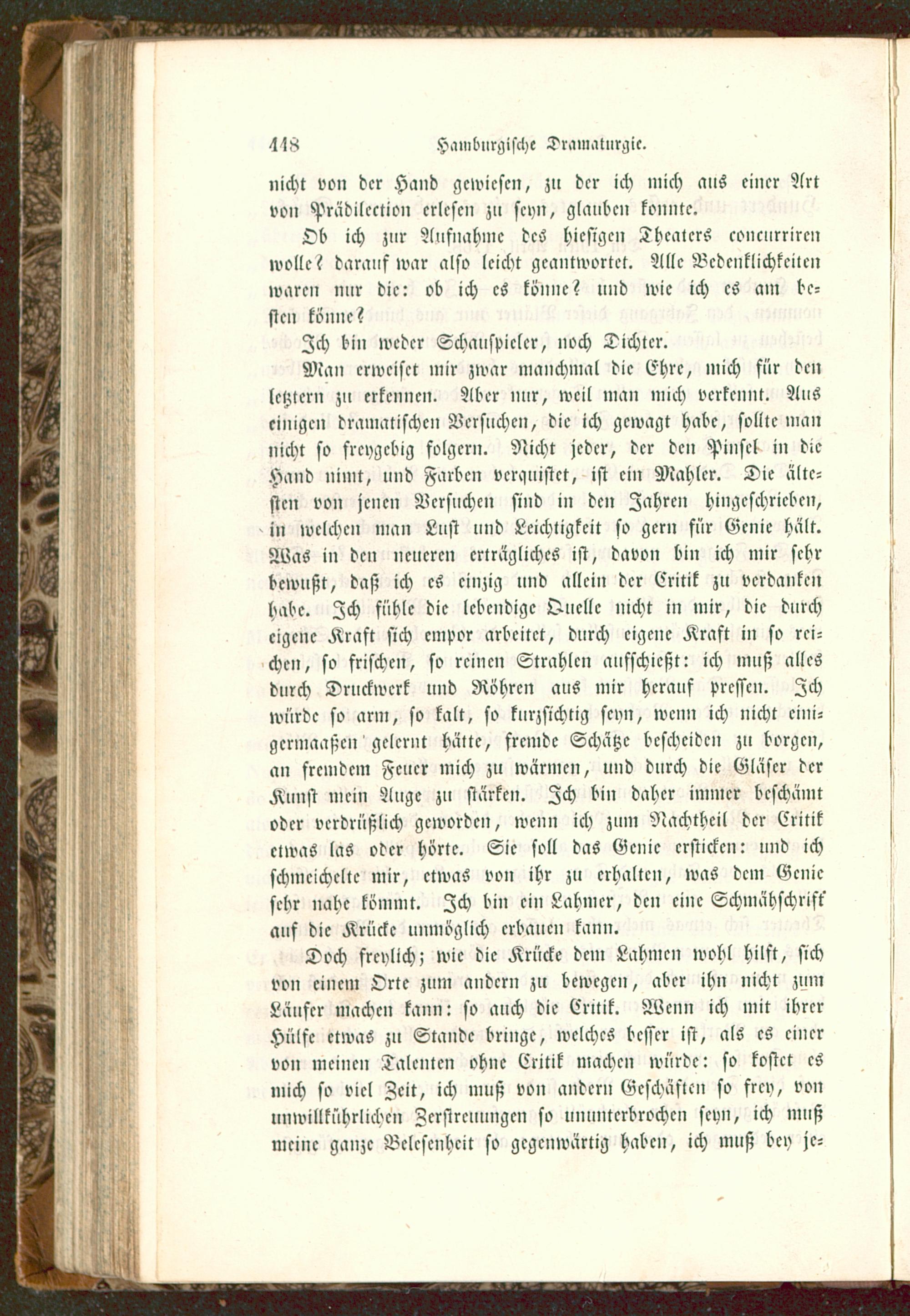 Man erweiset mir zwar manchmal die Ehre, mich für denletzter» zu erkenne». Aber nur, weil man mich verkennt. Auseinigen dramatischen Versuchen, die ich gewagt habe, sollte mannicht so freygebig folger». Nicht jeder, dcr dc» Pinsel in dieHand ninit, und Farben vcranistct, ist ein Mahler. Die älte-sten von jcncn Versuchen sind in den Zahrc» hi»gcschricbcn,in welchen man Lust und Leichtigkeit so gern für Genie hält.Was in den neueren erträgliches ist, davon bin ich mir sehrbewußt, daß ich es einzig und allein dcr Critik zu vcrdankcnhabe. Zch fühle die lebendige Quelle nicht in mir, die durcheigene Kraft sich empor arbeitet, durch eigene Kraft in so rei-cht», so frische», so reinen Strahlen aufschießt: ich muß allesdurch Druckwerk und Röhren aus mir herauf pressen. Ichwürde so arm, so kalt, so kurzsichtig sey», wenn ich nicht cini-gcrniaaßcn gelernt hältc, frcmdc Schätze bcschcidcn zu borgcn,an frc»idcm Fcucr mich zu wärmcn, und durch die Gläscr derKunst mein Auge zu stärke». Zch bi» daher immer beschämtoder vcrdrüßlich gcwordc», wcnn ich zum Nachtheil dcr Critikclwas las otcr hörtc. Sic soll das Gcnic crstickcn: und ichschmcichcltc mir, ctwas von ihr zu crhaltcn, was dcm Gcnicsebr nahe kömmt. Zch bin ein Lahmer, den eine Schmähschrift'auf die Krücke unmöglich erbaue» kann.
