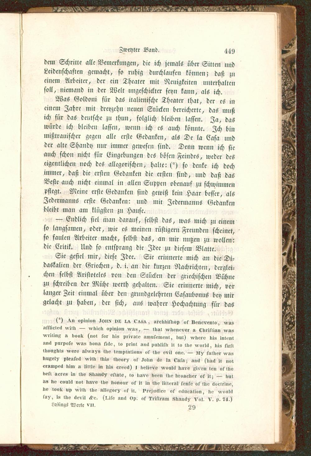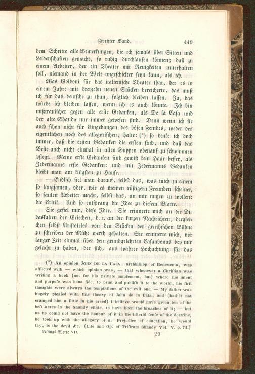 Was Goldoni für das italienische Theater that, der es ineinem Zahrc mit dreyzchn neuen Stücken bereicherte, das mußich für das deutsche zu thun, folglich bleiben lassen. Ja, daswürde ich bleiben lassen, wenn ich es auch könnte. Ich binmißtrauischer gegen alle erste Gedanken, als Dc la Easa undder alte Shandy nur immer gewesen sind. Denn wenn ich sieauch schon nicht für Eingebungen des bösen Feindes, weder deseigentlichen noch des allegorischen, Halle: (°) so denke ich dochimmer, daß die ersten Gedanken die ersten sind, und daß dasBeste auch nicht einmal in allen Suppen obenauf zu schwimmenpflegt. Meine erste Gedanken sind gewiß kein Haar besser, alsJedermanns erste Gedanken: und mir Jedermanns Gedankenbleibt man am klügsten zu Hause.
