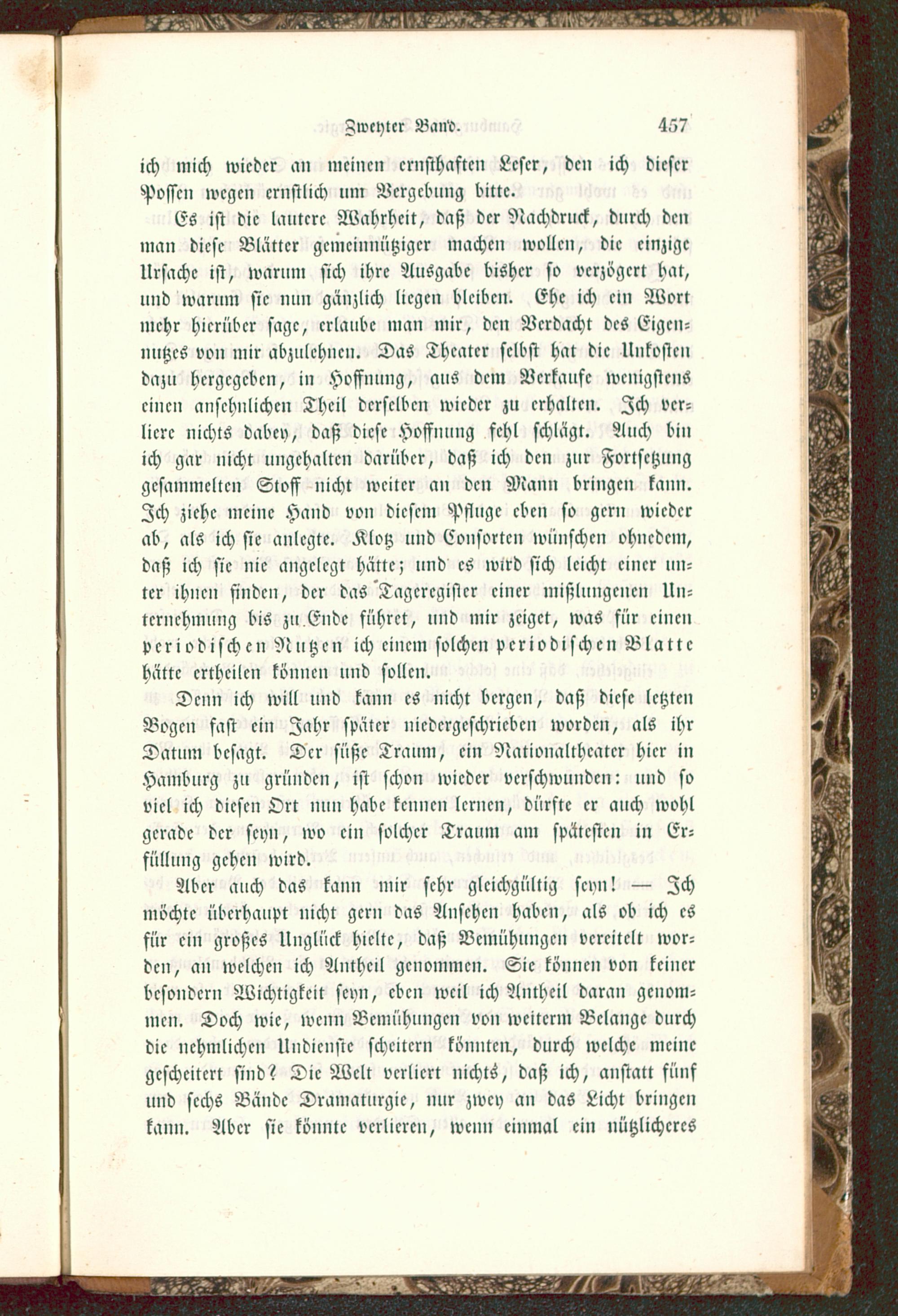 Denn ich will und kann cs nicht bergen, daß diese letztenBogen fast ein Zahr später niedergeschrieben worden, als ihrDatum besagt. Der süße Traum, ein Nationalthcatcr hier inHamburg zu gründen, ist schon wieder verschwunden: und soviel ich diesen Ort nun habe kennen lernen, dürfte er auch wohlgerade der seyn, wo ein solcher Traum am spätesten in Er-füllung gehen wird.