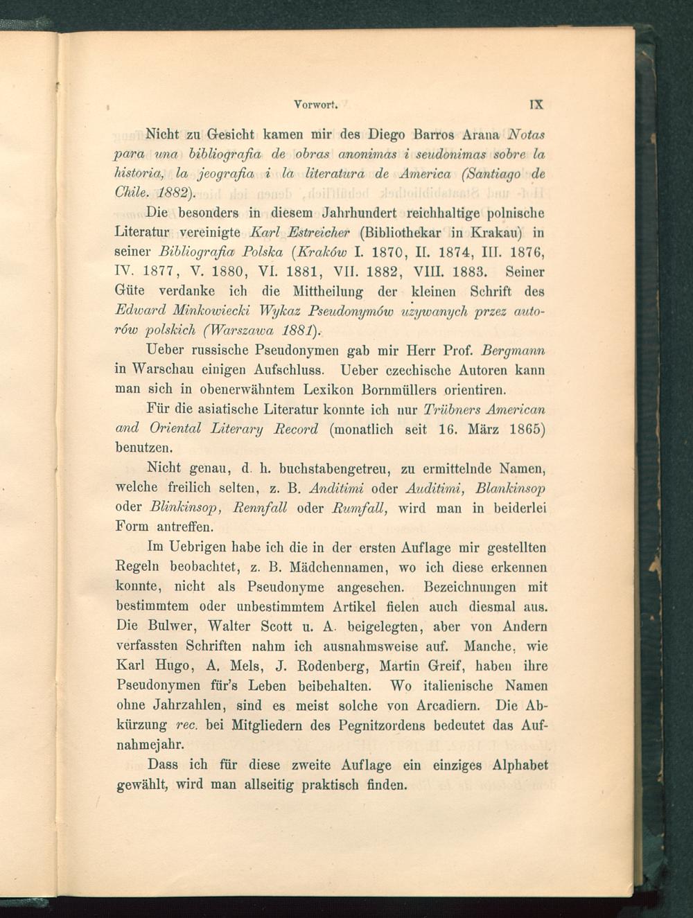 Im Uebrigen habe ich die in der ersten Auflage mir gestelltenRegeln beobachtet, z. B. Mädchennamen, wo ich diese erkennenkonnte, nicht als Pseudonyme angesehen. Bezeichnungen mitbestimmtem oder unbestimmtem Artikel fielen auch diesmal aus.Die Bulwer, Walter Scott u. A. beigelegten, aber von Andernverfassten Schriften nahm ich ausnahmsweise auf. Manche, wieKarl Hugo, A. Meis, J. Rodenberg, Martin Greif , haben ihrePseudonymen für’s Leben beibehalten. Wo italienische Namenohne Jahrzahlen, sind es meist solche von Arcadiern. Die Ab-kürzung rec. bei Mitgliedern des Pegnitzordens bedeutet das Auf-nahmejahr.