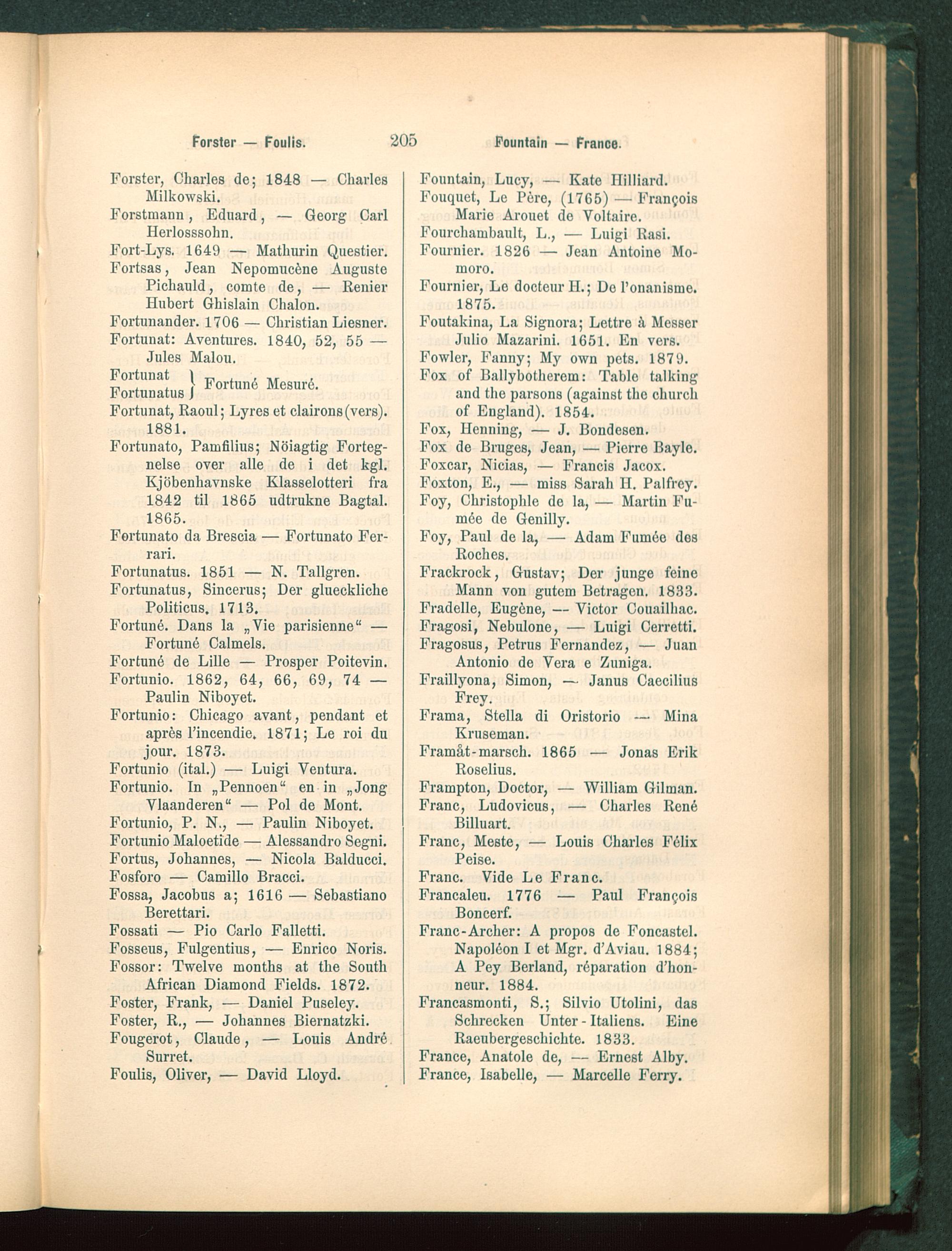 Fort-Lys. 1649 — Matliurin Questier.Fortsas, Jean Nepomucfene AugustePichauld, comte de, — RenierHubert Ghislain Chalon.Fortunander. 1706 — Christian Liesner.Fortunat: Aventures. 1840, 52, 55 —Jules Malou .
