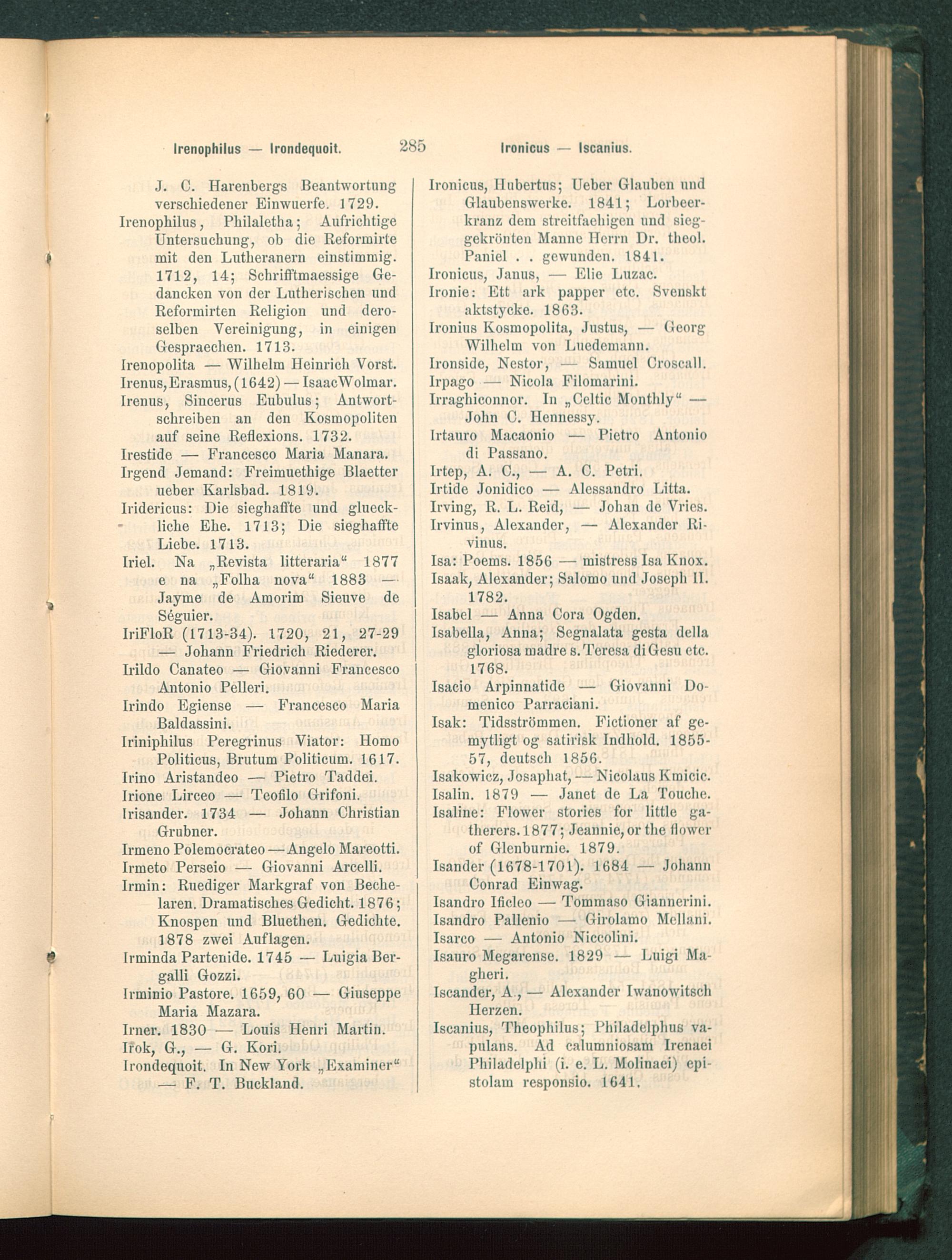 Irenophilus, Pliilaletha; AufrichtigeUntersuchung, ob die Reformirtemit den Lutheranern einstimmig.1712, 14; Schrifftmaessige Ge-dancken von der Lutherischen undReformirten Religion und dero-selben Vereinigung, in einigenGespraechen. 1713.
