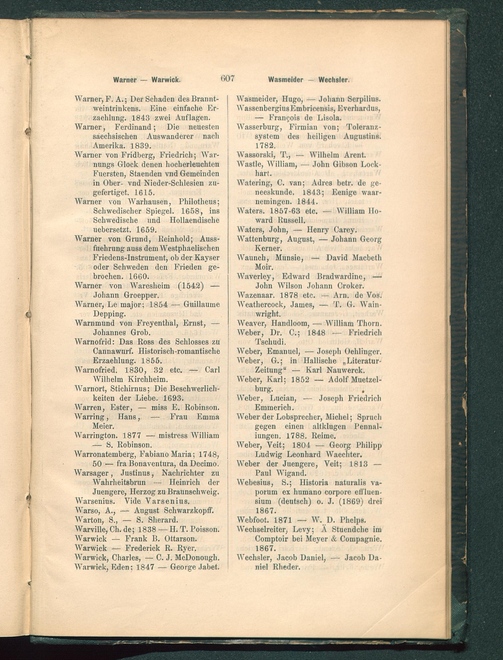 Warner, F. A.; Der Schaden des Brannt-weintrinkens. Eine einfache Er-zaehlung. 1843 zwei Auflagen.