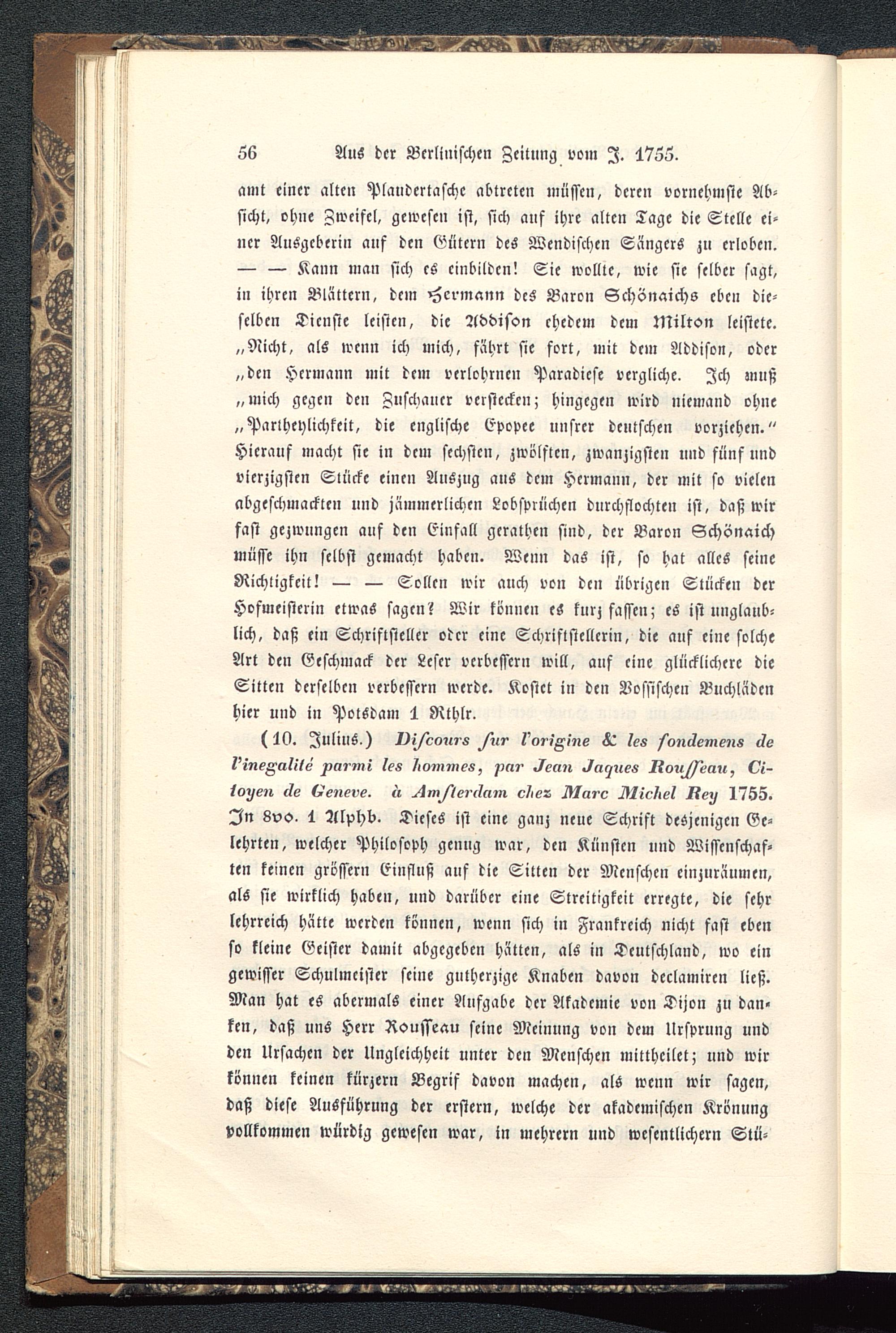 (40. Julius.) /)l/co«^« ^«i' /'o^iAkiie A /es /onc/eme?!« t/s/'»nsA '«///« ^a^nii /ivnimes, ^>n^ ^en» ^a^«e« ^?o?t^eau, t?t-/oi/e?i l/s 6?e?ieiie. « ^tm/?e?v?am o/ieL ^/a^c A/i'c/ie/ 1733.In 8vo> 1 Alphb. Tiefes ist eine ganz neue Schrift desjenigen Ge-lehrten, welcher Philosoph genug war, den Künsten und Wissenschaf-ten keinen grösser» Einfluß auf die Sitten der Menschen einzuräumen,als sie wirklich haben, und darüber eine Streitigkeit erregte, die sehrlehrreich hätte werden können, wenn sich in Frankreich nicht fast ebenso kleine Geister damit abgegeben hätten, als in Teutschland, wo eingewisser Schulmeister seine gutherzige Knaben davon declamiren ließ.Man hat es abermals einer Aufgabe der Akademie von Tijon zu dan-ken, daß uns Herr Rousseau seine Meinung von dem Ursprung undden Ursachen der Ungleichheit unter den Menschen mittheilet; und wirkönnen keinen kürzern Begrif davon machen, als wenn wir sagen,daß diese Ausführung der erster», welche der akademischen Krönungvollkommen würdig gewesen war, in mehrern und wesentlichern Stü-