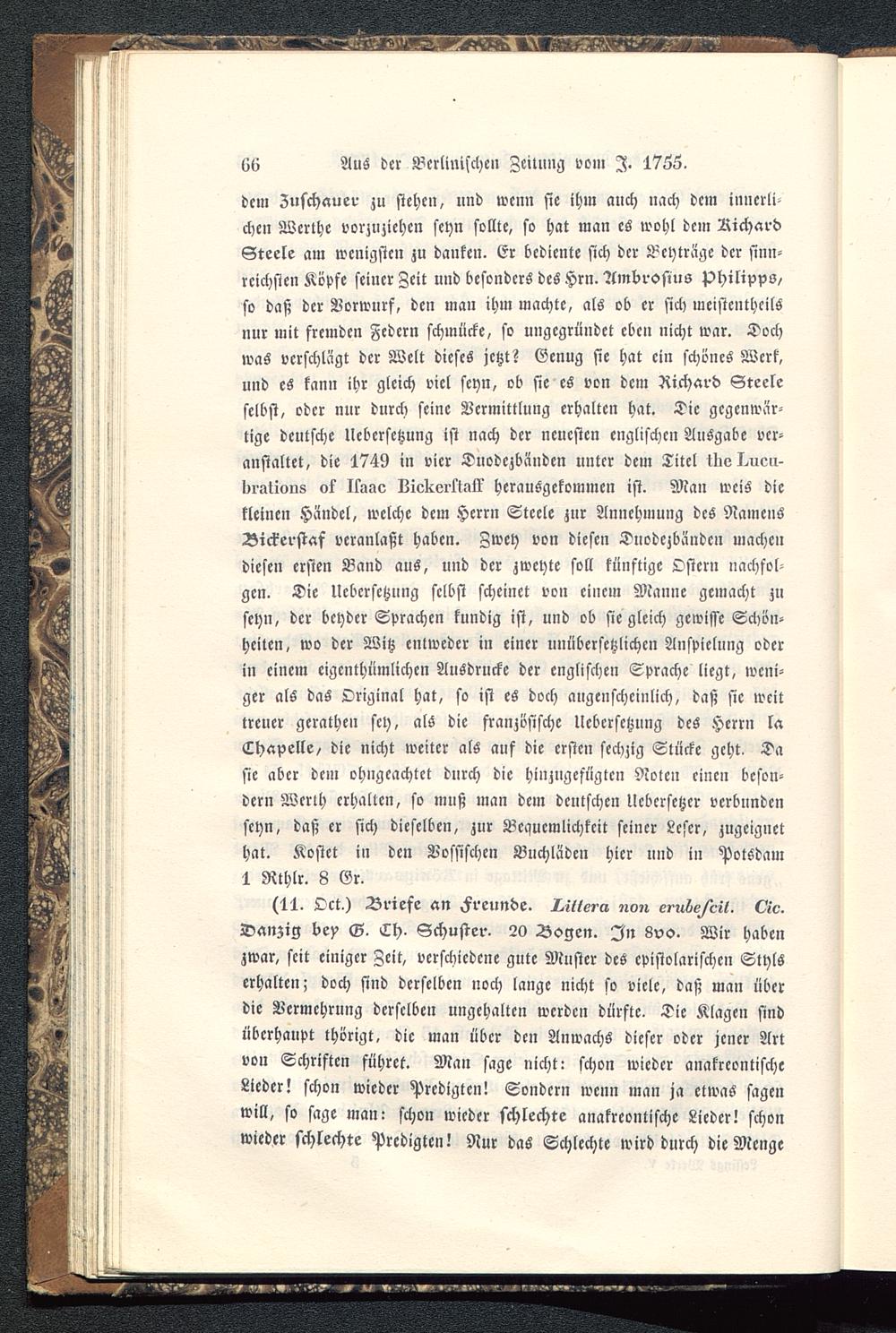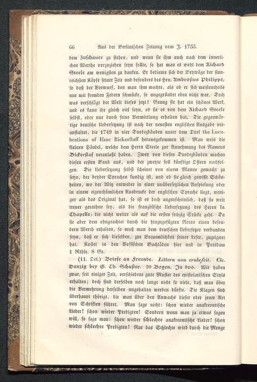 dem Zuschauer zu stehen, und wenn sie ihm auch nach dem innerlichen Werthe vorzuziehen seyn sollte, so hat man es wohl dem RichardSteele am wenigsten zu danken. Er bediente sich der Beyträge der sinn-reichsten Kopfe seiner Zeit und besonders des Hrn. Ambrosius Philipps/so daß der Vorwurf, den man ihm machte, als ob er sich meistenthcilSnur mit fremden Federn schmücke, so ungcgriiiidet eben nicht war. Dochwas verschlagt der Welt dieses jetzt? Genug sie hat ein schönes Werk,und es kann ihr gleich viel seyn, ob sie es von dem Richard Steele selbst, oder nur durch seine Vermittlung erhalten hat. Die gegenwär-tige deutsche Ucbersctzung ist nach der neuesten englischen Ausgabe ver-anstaltet, die 1749 in vier Dnodczbänden unter dem Titel lliel^ien-Iiratious ok Ilsao LiokerÜal? herausgekommen ist. Man weis diekleinen Händel, welche dem Herrn Steele zur Annehmung des NamensBickerstaf veranlaßt haben. Zwey von diesen Duodezbändcn machendiesen ersten Band aus, und der zweyte soll künftige Ostern nachfol-gen. Die Uebcrsetzung selbst scheinet von einem Manne gemacht znseyn, der beyder Sprachen kundig ist, und ob sie gleich gewisse Schön-heilen, wo der Witz entweder in einer unübersetzlichen Anspielung oderin einem eigenthümlichen Ausdrucke der englischen Sprache liegt, weni-ger als das Original hat, so ist es doch augenscheinlich, daß sie weittreuer gerathen sey, als die französische Uebcrsetzung des Herrn laChapelle, die nicht weiter als auf die ersten sechzig Stücke geht. Dasie aber dem ohngcachtet durch die hinzugefügten Noten einen beson-dern Werth erhallen, so muß man dem deutschen Ucbcrsetzer verbundenseyn, daß er sich dieselben, zur Bequemlichkeit seiner Leser, zugeignethat. Kostet in den Vossischen Buchlädcn hier und in Potsdam1 Rthlr. 8 Gr.