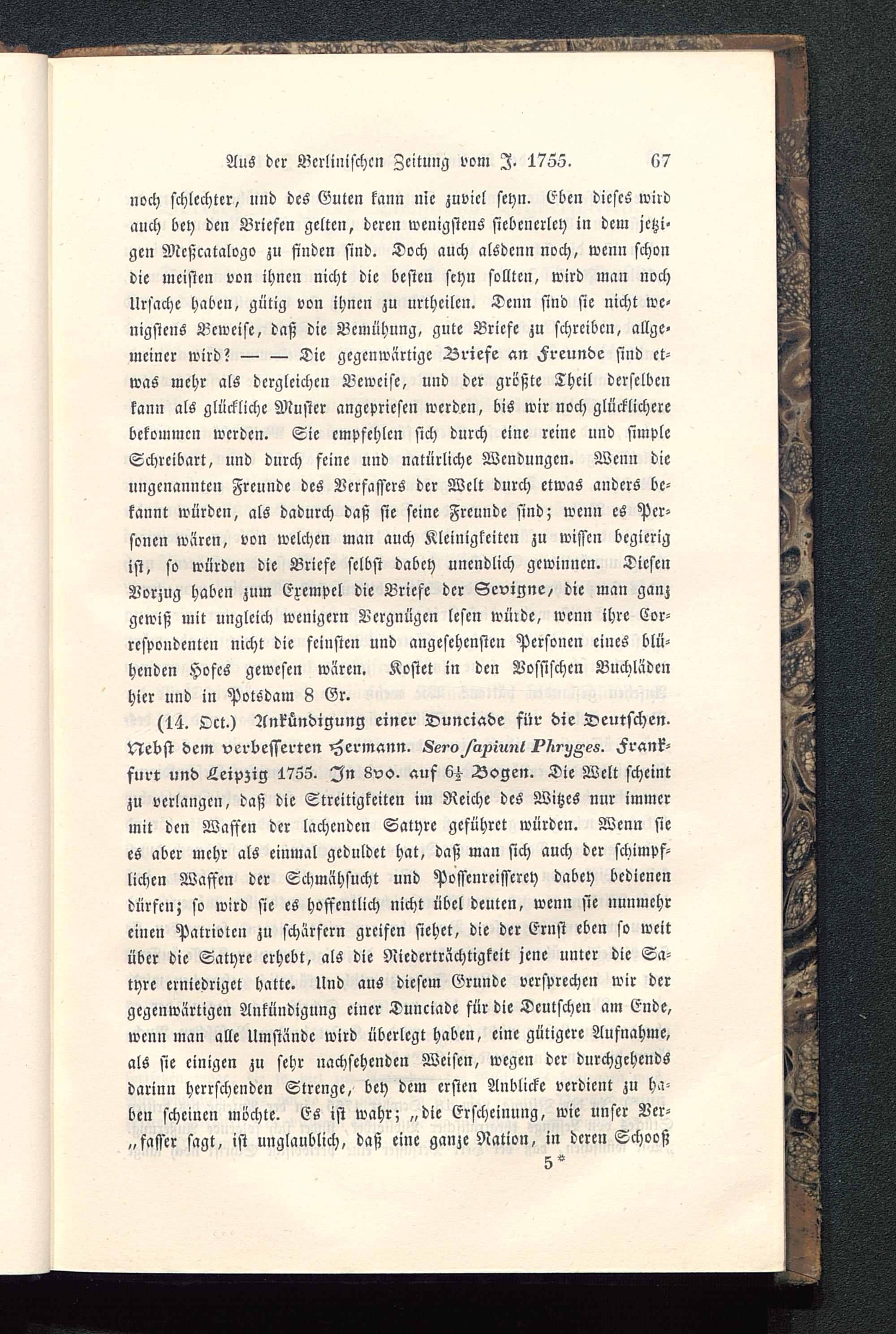 noch schlechter, und des Guten kann nie zuviel seyn. Eben dieses wirdauch bey den Briefen gelten, deren wenigstens siebenerlcy in dem jctzi-gen Meßcatalogo zu finden sind. Doch auch alSdcnn noch, wenn schondie meisten von ihnen nicht die beste» seyn sollten, wird man nochUrsache haben, gütig von ihnen zu urtheilen. Denn sind sie nicht we-nigstens Beweise, daß die Bemühung, gute Briefe zu schreiben, allge-meiner wird?--Die gegenwärtige Briefe an Freunde sind et-was mehr als dergleichen Beweise, und der größte Theil derselbenkann als gluckliche Muster angepriesen werden, bis wir noch glücklicherebekommen werden. Sie empfehlen sich durch eine reine und simpleSchreibart, und durch feine und natürliche Wendungen. Wenn dieungenannten Freunde des Verfassers der Welt durch etwas anders be-kannt würden, als dadurch daß sie seine Freunde sind; wenn es Per-sonen wären, von welchen man auch Kleinigkeiten zu wissen begierigist, so würde» die Briefe selbst dabey unendlich gewinnen. DiesenVorzug haben zum Exempel die Briefe der Sevigne, die man ganzgewiß mit ungleich wenigern Vergnügen lesen würde, wenn ihre Cor-respoudenten nicht die feinsten und angesehensten Personen eines blü-henden Hofes gewesen wären. Kostet in den Vossische» Buchlädenhier und in Potsdam 8 Gr.
