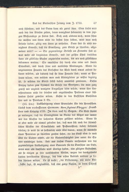 (14. Oct.) Ankündigung einer Dunciade für die Deutschen-Nebst dem verbesserten Hermann. Se?'o/a/intt-i I^,,Z>es. Frank-furt und Leipzig 1735. In 8vo. auf 6^ Bogen. Die Welt scheintzu verlangen, daß die Streitigkeiten im Reiche des Witzes nur immermit den Waffen der lachenden Satyre geführct würden. Wenn siees aber mehr als einmal geduldet hat, daß man sich auch der schimpf-lichen Waffen der Schmähsucht und Possenreisscrey dabey bedienendürfen; so wird sie es hoffentlich nicht übel deuten, wenn sie »liiimehreinen Patrioten zu schärfer» greifen siehet, die der Ernst eben so weitüber die Satyre erhebt, als die Niederträchtigkeit jene unter die Sa-tyre erniedriget hatte. Und aus diesem Grunde versprechen wir dergegenwärtigen Ankündigung einer Dunciade für die Deutschen am Ende,wenn man alle Umstände wird überlegt haben, eine gütigere Aufnahme,als sie einigen zu sehr nachsehenden Weisen, wegen der durchgchendsdarum herrschenden Strenge, bey dem ersten Anblicke verdient zu ha-ben scheinen mochte. Es ist wahr; „die Erscheinung, wie unser Ver-fasser sagt, ist unglaublich, daß eine ganze Nation, in deren Schooß
