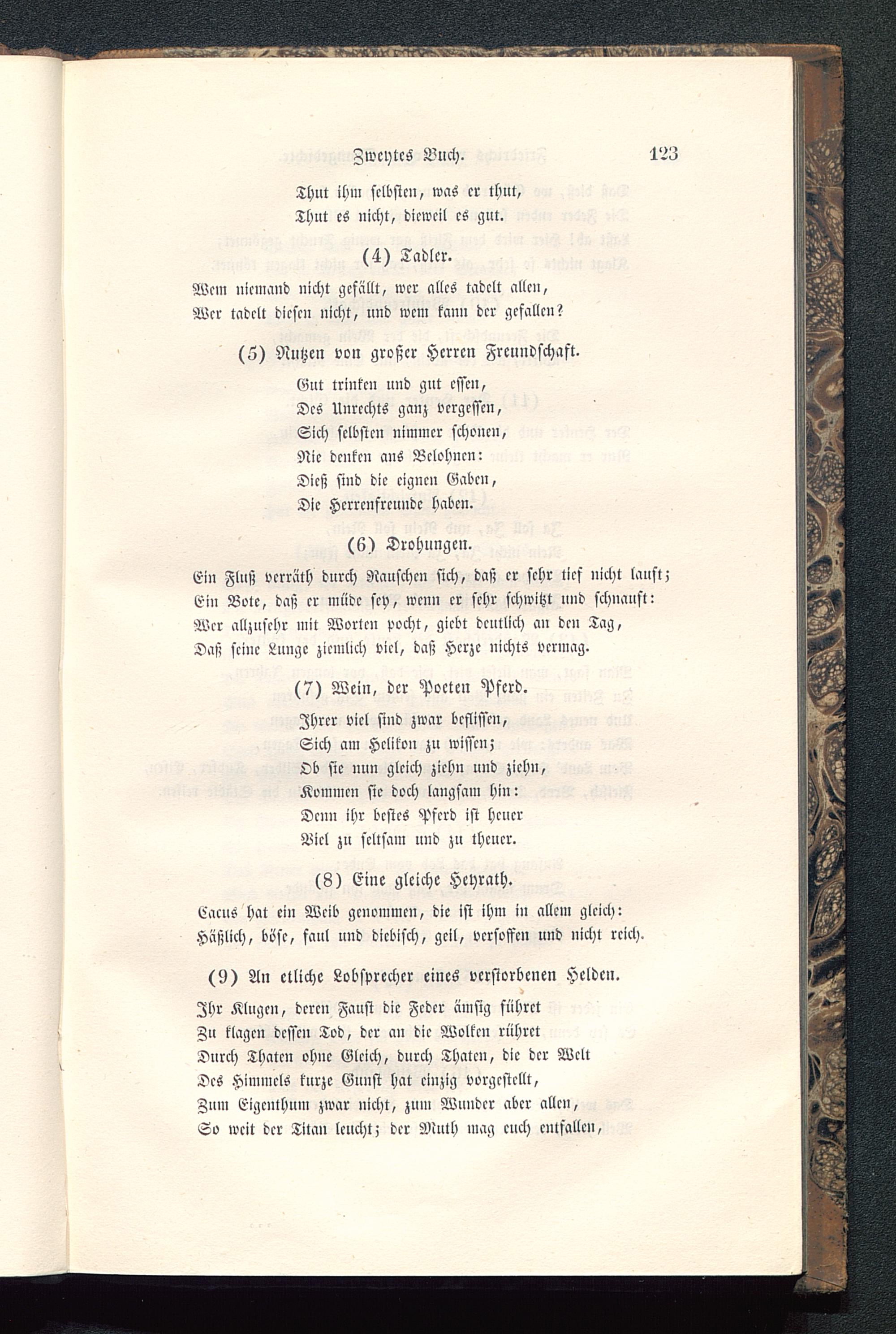 Ein Fluß verräth durch Rauschen sich, daß er sehr lies nicht laust;Ein Bote, daß er müde sey, wenn er sehr schwitzt und schnauft:Wer allzusehr mit Worten pocht, giebt deutlich an den Tag,Daß scinc Lunge ziemlich viel, daß Herze nichts vermag.