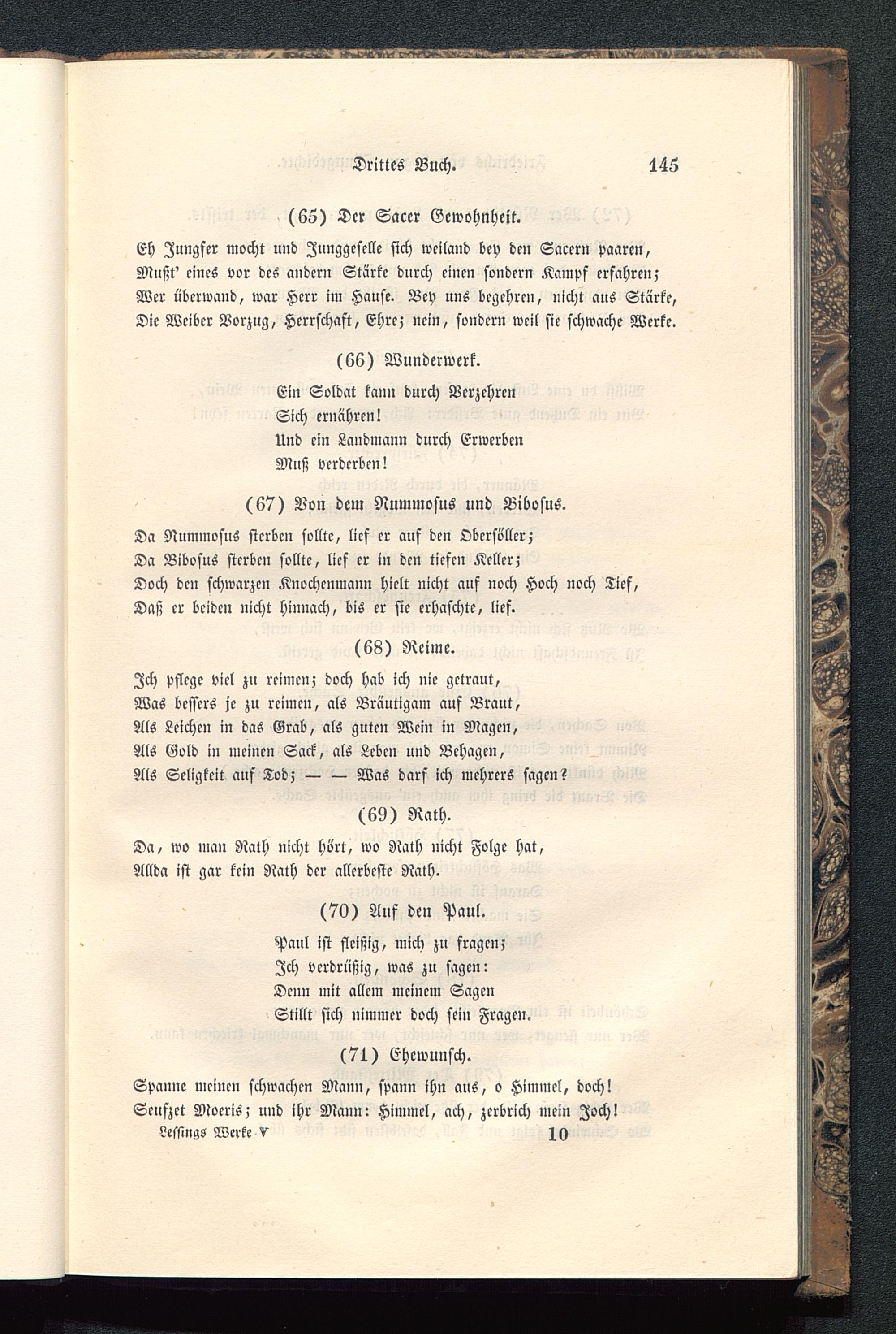 Eh Jungfer möcht und Junggeselle sich weiland bev den Saccrn paaren,Mußt' eines vor des andern Stärke durch einen sondern Kampf erfahre»;Wer überwand, war Herr im Hause. Bev uns begehren, nicht aus Starke,Die Weiber Vorzug, Herrschaft, Ehre; nein, sondern weil sie schwache Werke.