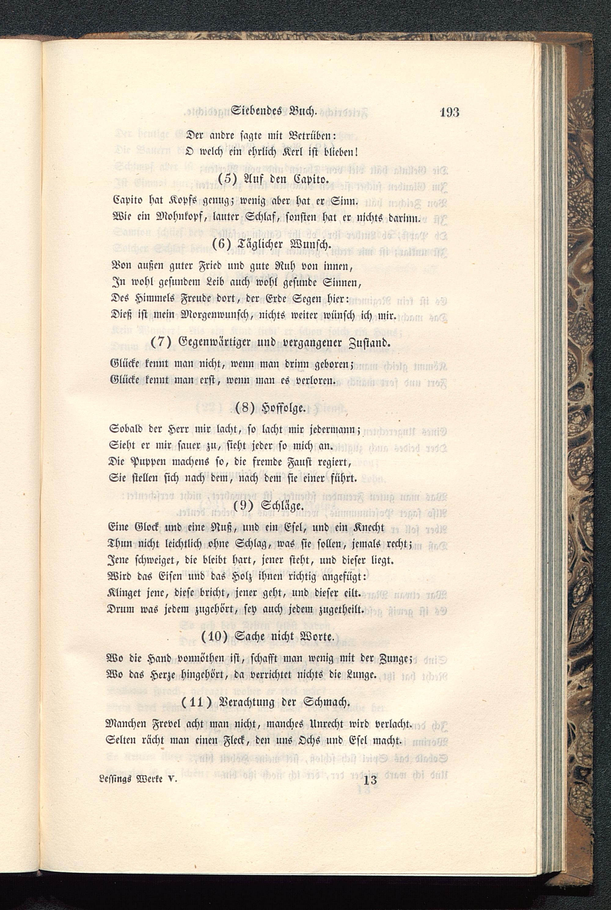 Eine Glock und eine Nuß, und ein Esel, und ein KnechtThu» nicht leichtlich ohne Schlag, was sie sollen, jemals recht;Iciic schweiget, die bleibt hart, jc»er steht, und dieser liegt.Wird das Eisen und das Holz ihnen richtig angefügt:Klinget jene, diese bricht, jener geht, und dieser eilt.Drum was jedem zugehört, sey auch jedem zugetheilt.